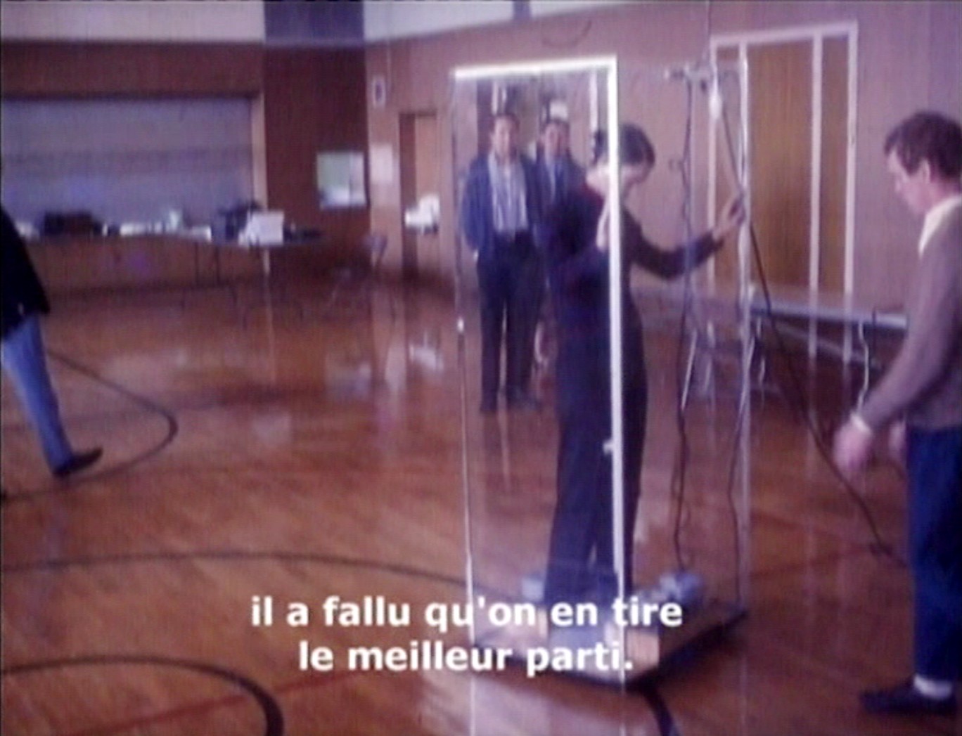 Disciple de Merce Cunningham, Robert Rauschenberg et John Cage, Lucinda Childs participe au Judson Dance Theater dans les années 1960. En 1976, elle sera chorégraphe et interprète d’Einstein on the Beach de Bob Wilson et Philip Glass. Fascinée par l’interaction entre le corps et les objets, et par la manière dont un danseur peut produire sa propre musique par ses mouvements, l’artiste voit dans Vehicle une occasion inédite de travailler avec des moyens technologiques d’envergure. Avec les ingénieurs des laboratoires Bell, elle conçoit une œuvre aux formes géométriques autour de la transmission de signaux sonores et lumineux. Les performeurs agissent ici plus comme des opérateurs que comme de véritables danseurs. Isolé dans une cabine de plexiglas, Alex Hay remet trois seaux illuminés à William Davis qui les suspend à une charpente. Lucinda Childs impulse et contrôle leur balancement qui fait varier les fréquences d’un faisceau d’ultrasons, ainsi que les ombres qu’ils projettent.