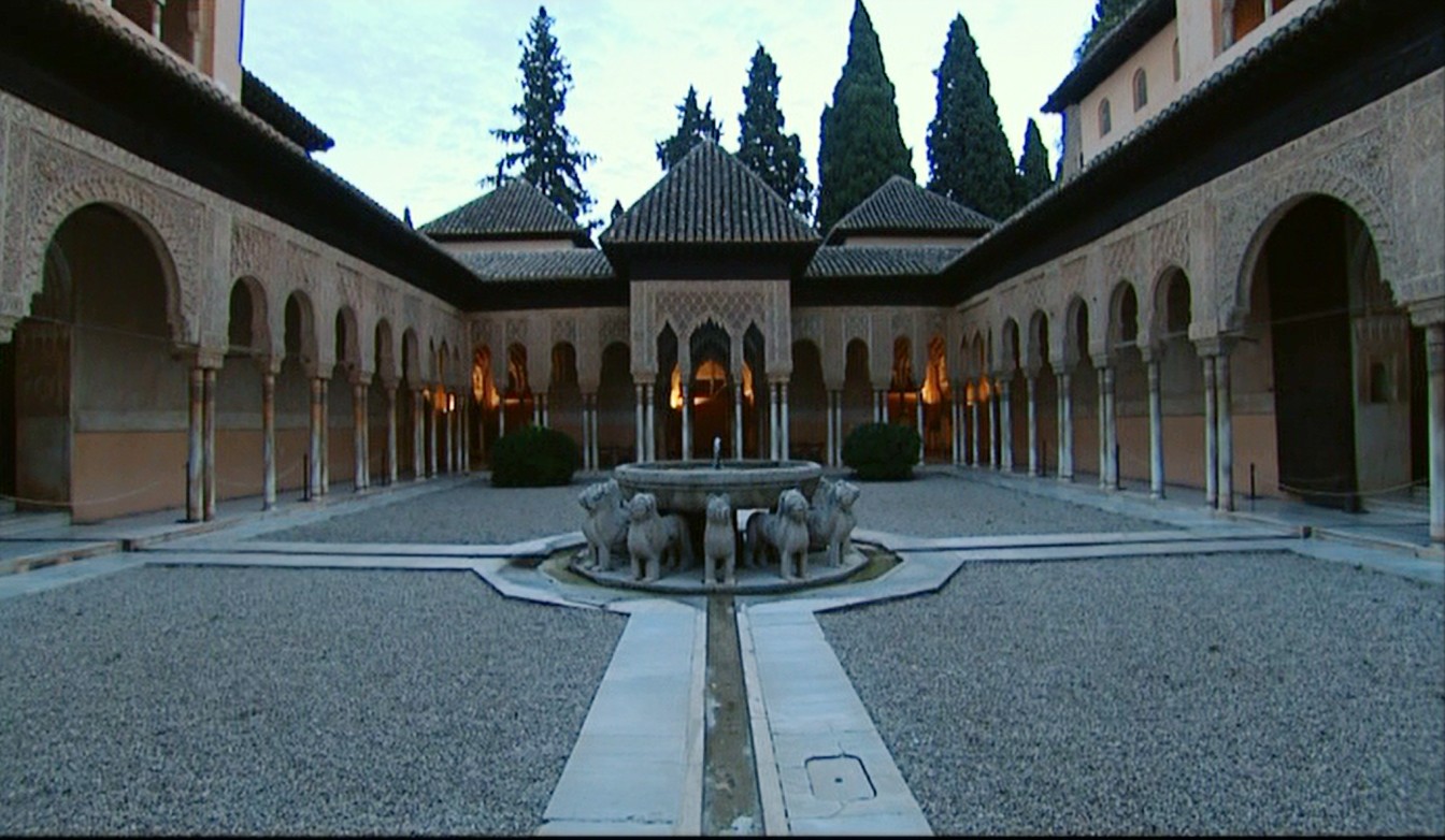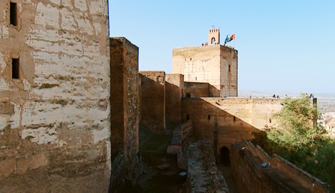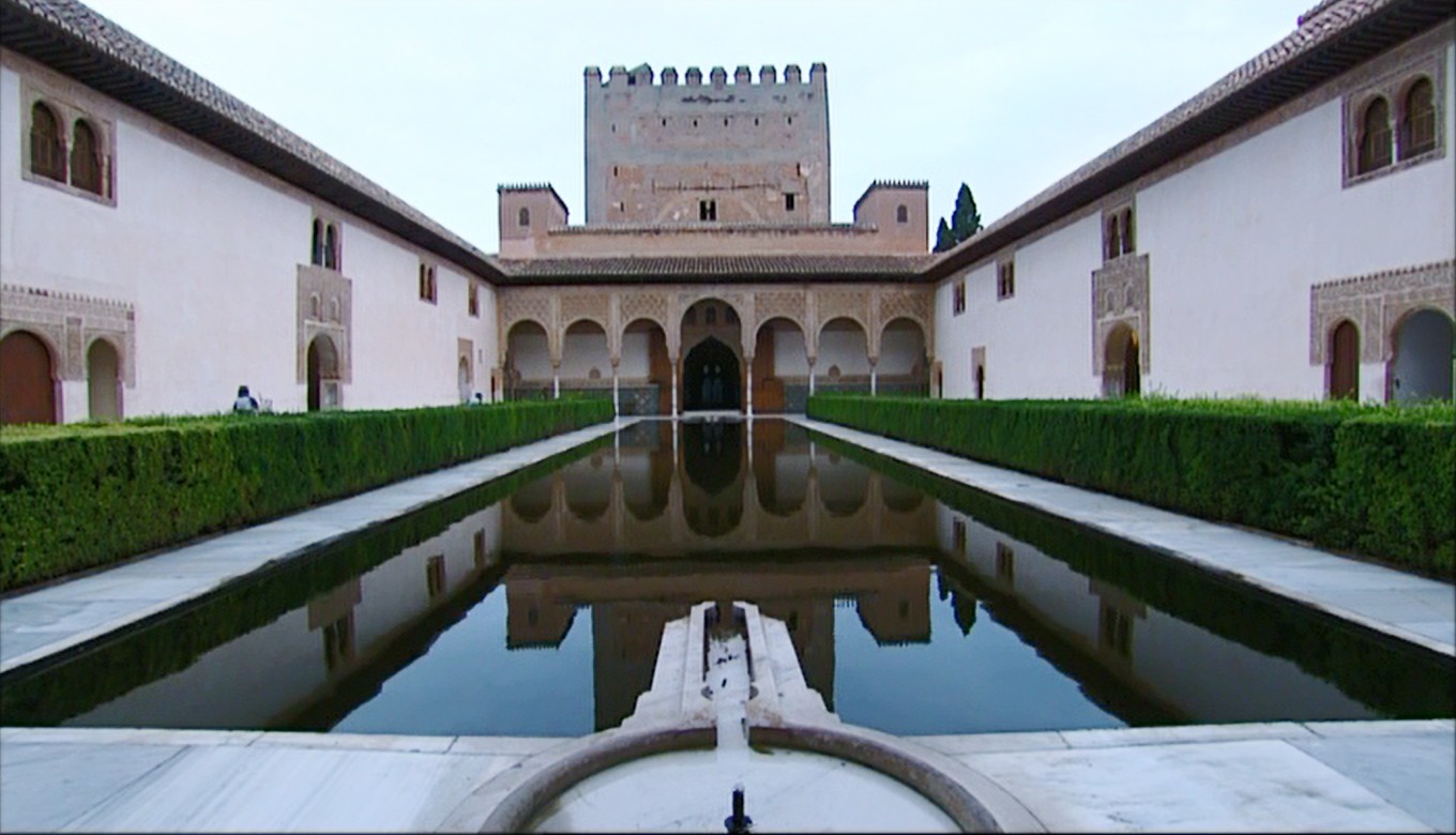 C'est au XIVe siècle, sur les murs d'une forteresse plus ancienne, que l'ensemble des deux palais est construit par deux califes successifs. Avec une entrée modeste au bout d'une allée, les bâtiments s’organisent autour d’un patio, la cour des Myrtes et la cour des Lions. La progression vers les espaces du pouvoir, de la justice, de la prière ou des bains s’inscrit dans un dispositif précis. La géométrie et la symbolique règlent le tracé des plans et des décors. Dans cette architecture de l'intime, les regards sont captivés par l’orfèvrerie de stuc et de bois qui orne murs et plafonds, les colonnes délicates ou encore les fontaines et bassins. Prolongeant ce dédale vers l’extérieur, les jardins, métaphores du paradis, sont traversés par des jeux d'eau. A la fin du XVe siècle, les rois catholiques conquérants s’approprient ces merveilles. Le palais Renaissance bâti à leur côté par Charles Quint affirme magistralement, dans la pierre et la symétrie, la marque du nouveau pouvoir.