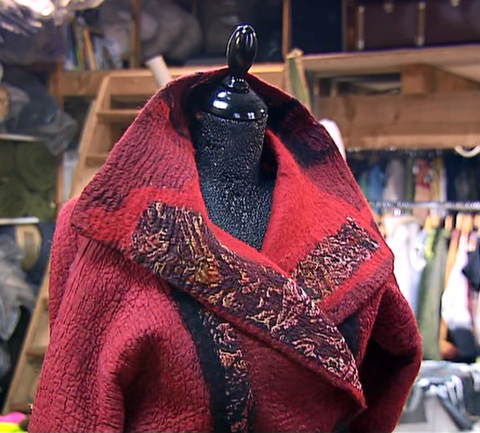 5. Françoise Hoffmann, artiste feutrière. Issue du théâtre, c’est en admirant les chapeaux de Philippe Model qu'elle a découvert le feutre. Aujourd'hui maître d’art, membre des Grands Ateliers de France, elle fabrique cette matière dans son atelier à la Croix-Rousse à Lyon, historiquement celui de la soie, et crée des vêtements : de vastes manteaux, mais aussi des gants, en collaboration avec la créatrice gantière Marie Beyer à Paris. Entre les étagères remplies de fibres de laine aux couleurs vives, les portants de vêtements et les grandes tables, Françoise Hoffmann parle de sa passion : "J’ai été attirée par le feutre tant pour ses couleurs que pour ses densités de matière. On peut travailler sans couture, c’est vraiment une matière que l’on modèle, c’est du moulage et on crée des sculptures." Penchée sur la table, elle répartit la fibre de laine de manière homogène sur une natte, l’humidifie, la recouvre d’une moustiquaire, la savonne puis la foulonne en roulant la natte. Une fois la matière de base réalisée, elle fabrique un vêtement avec un gabarit sur lequel elle moule le feutre.