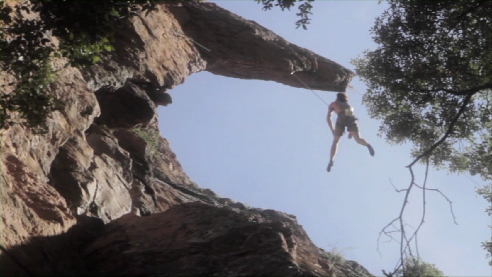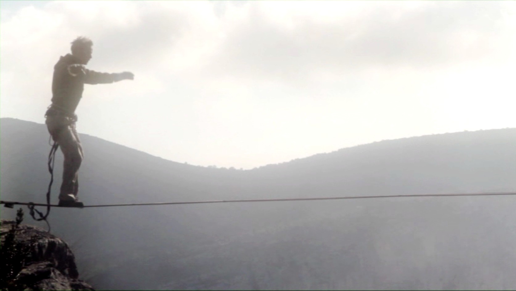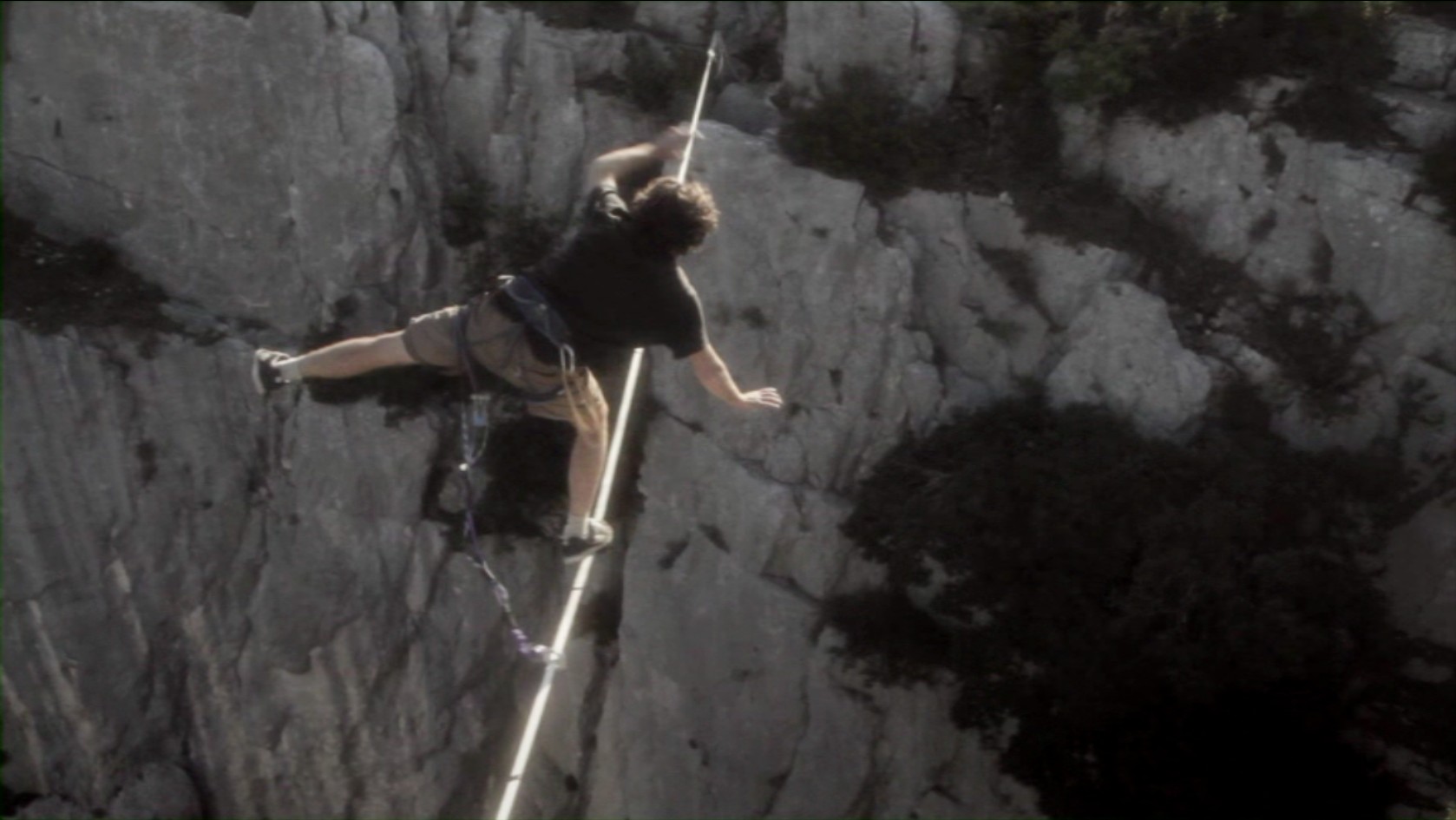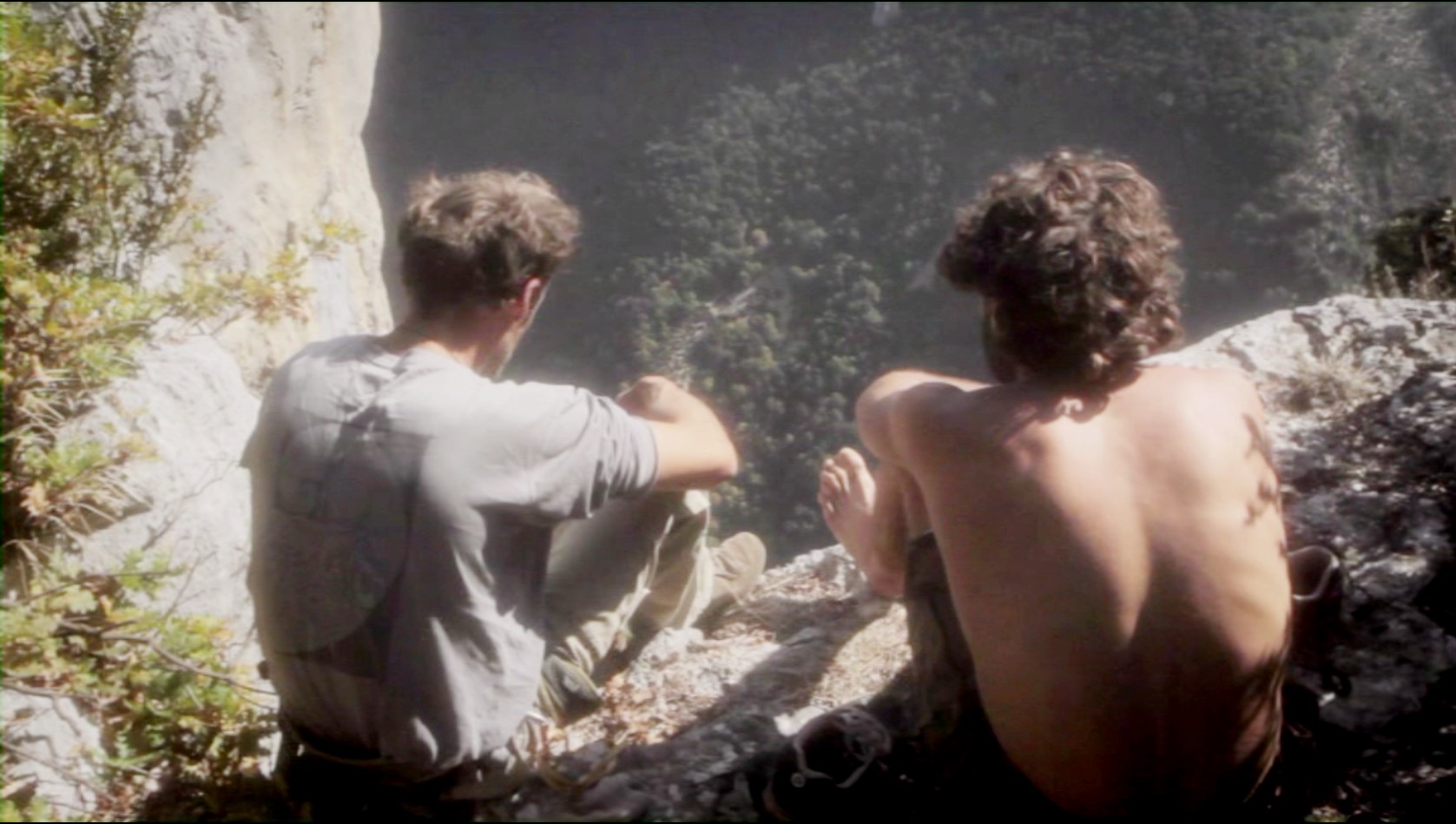 Deux jeunes sportifs s’enfoncent dans une forêt méridionale. Ils atteignent une paroi rocheuse que, malgré leurs efforts obstinés, ils ne parviendront pas à escalader. La nuit, les voilà qui se jettent d’un pont enjambant un profond ravin. Autre défi : ils tentent de marcher sur une corde tendue au-dessus d’une gorge vertigineuse. Ne mettant jamais leurs vies en danger, ils travaillent avec constance à maîtriser la technique et surmonter la peur.