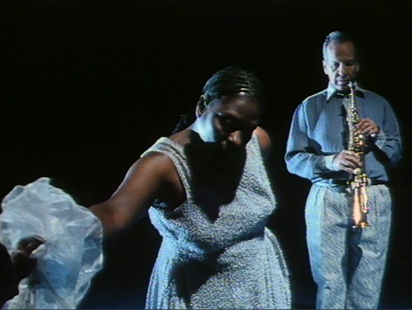 Jeux d'improvisations entre les notes acides et percutantes de Steve Lacy et le mouvement ample, puissant mais saccadé d'Elsa Wolliaston. La performance est ponctuée par de courtes séquences où l'image de la danseuse hante le saxophoniste. Venue des pulsions de la danse africaine traditionnelle, la danse d'Elsa Wolliaston s'est peu à peu modifiée au contact de l'Europe et se laisse volontiers porter, depuis quelques années, par les accents gutturaux et syncopés du free jazz de Steve Lacy. Filmés dans un espace si vaste que les murs sont invisibles, les deux solistes semblent flotter au-dessus du sol bleu pâle et lumineux.