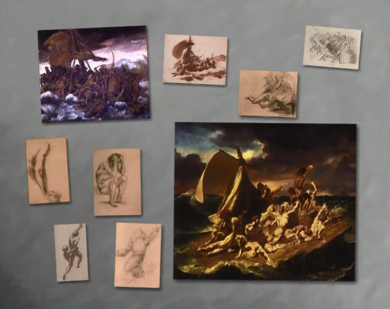 Le retentissement du naufrage de la Méduse, frégate partie pour asseoir la possession française du Sénégal et échouée par incompétence de son commandant, est tel qu’il engendre illico des remous politiques et une multitude de traces écrites et d’images populaires. Géricault y voit le sujet idéal pour son grand œuvre. Avide de documents, il se fera raconter par les rares survivants l’abandon des inférieurs par la hiérarchie militaire, le radeau ingouvernable, la mutinerie, les massacres, les blessés jetés à la mer, le cannibalisme et enfin le sauvetage. Une centaine de dessins témoignent de la genèse d’une œuvre sombre qui concentre le drame dans une pyramide de corps, entre une vague déferlante et un minuscule vaisseau à l’horizon. Sa soif de vérité pousse l’artiste à portraiturer des rescapés et un modèle noir. Il peint parallèlement sa série de fragments macabres. Mais un réalisme trop cru est encore impossible et les corps musclés s'inspirent plus de Michel-Ange que des témoignages.