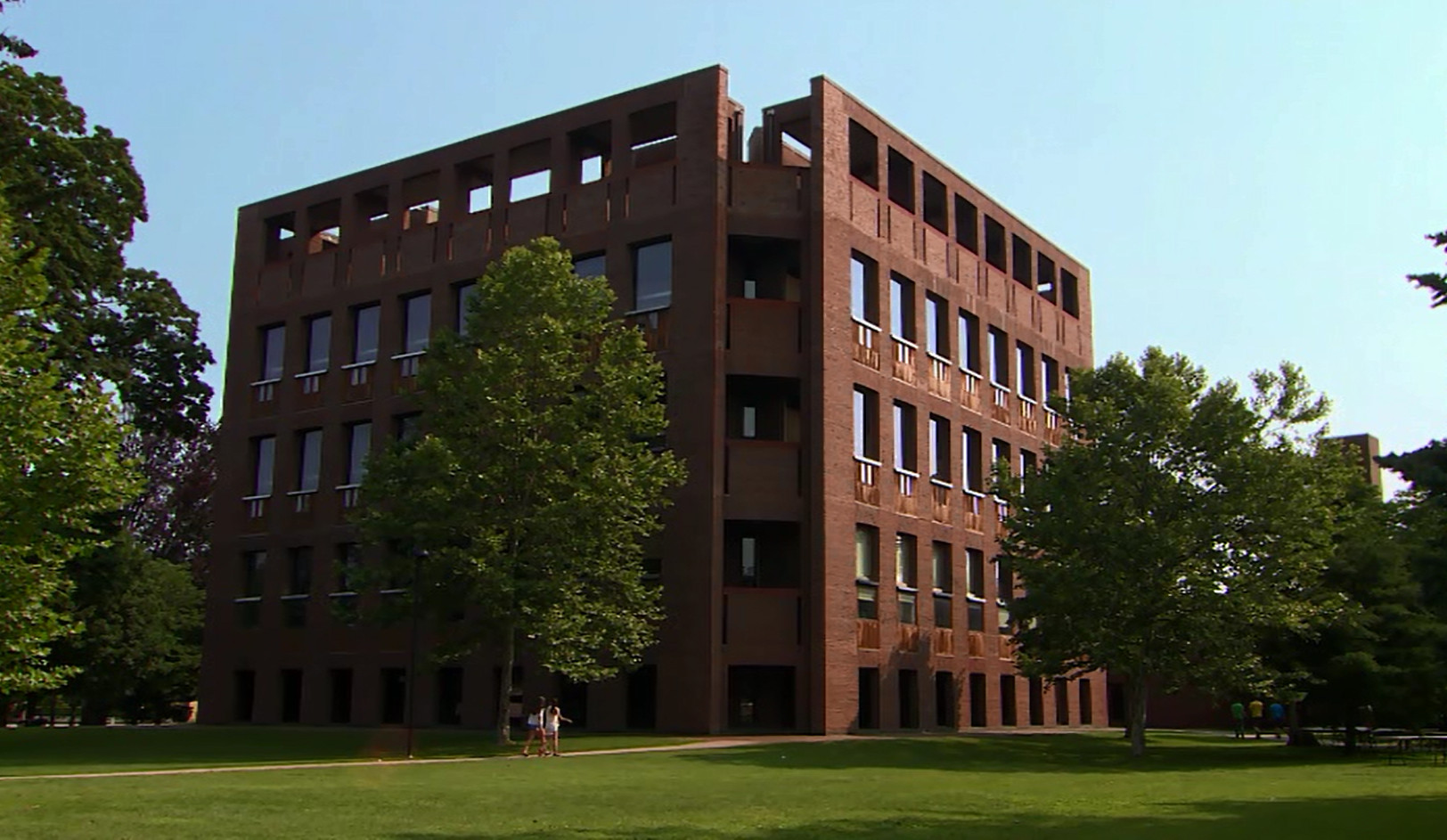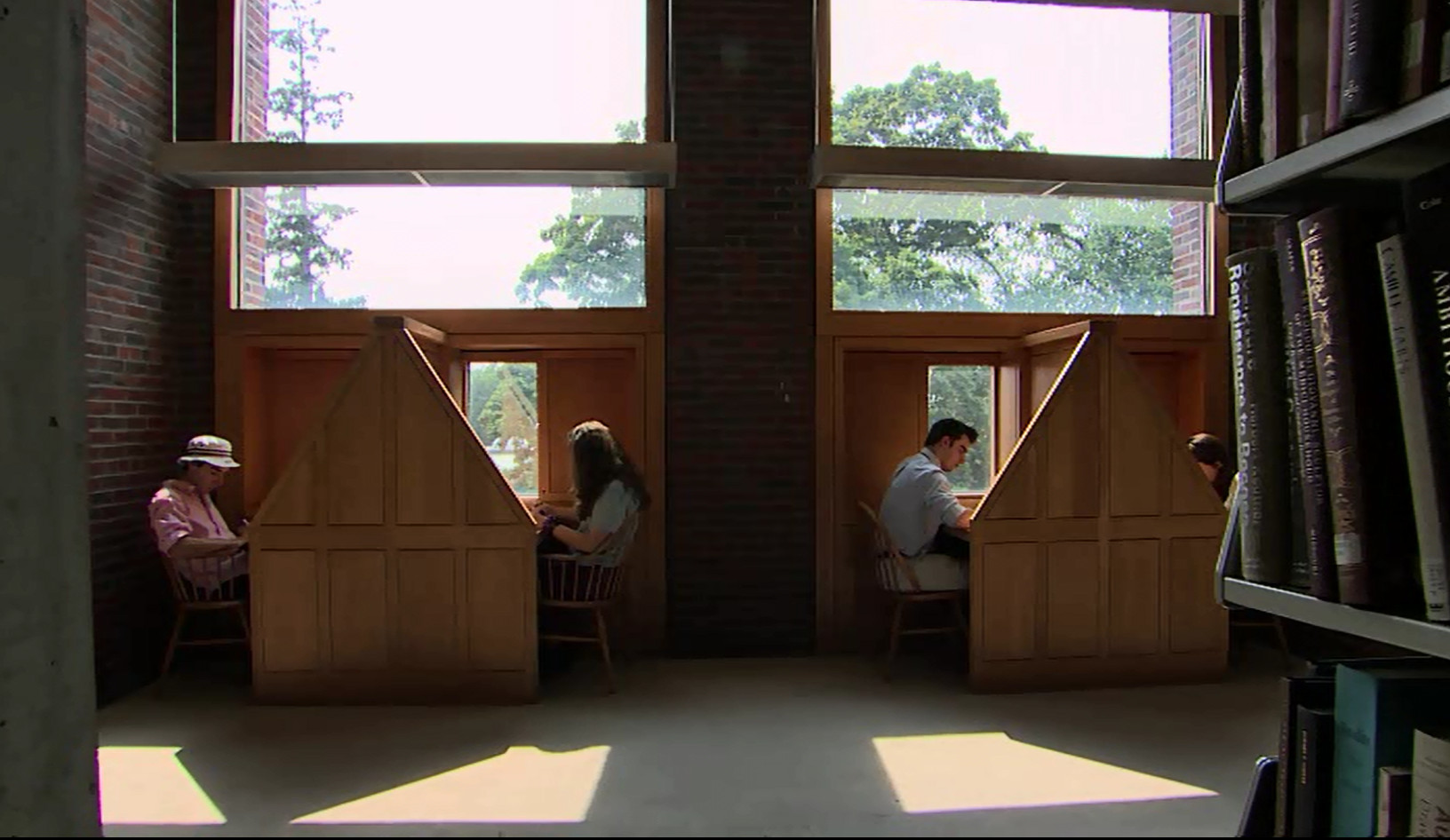 Pour répondre au programme qui précisait que “le plus important n’est pas d’abriter des livres mais des lecteurs”, Kahn dessine une typologie inhabituelle : chaque lecteur dispose d’un petit espace individuel de lecture éclairé par une fenêtre. Ces espaces occupent le périmètre extérieur de chacun des niveaux d’un cube de huit étages. Dans le périmètre intérieur, il dispose des rayonnages accessibles par tous, contrairement aux bibliothèques anciennes où les livres se trouvent dans un magasin fermé. Le cœur du cube est occupé par un hall monumental d’une hauteur de six étages. Tout dans cet espace n’est que géométrie élémentaire : le plan en carré, la croix surdimensionnée en béton qui permet de soutenir le plafond, les quatre oculi gigantesques percés dans les murs du hall, qui laissent apercevoir l’ensemble des rayonnages situés en arrière. La diversité des espaces est marquée par les éclairages (petites fenêtres latérales, baies plus larges ou encore lumière zénithale) mais aussi par les matériaux utilisés : brique pour la façade et les espaces de lecture, béton brut pour les espaces de stockage, bois pour les rayonnages et l’ensemble du mobilier, travertin pour le sol du hall.