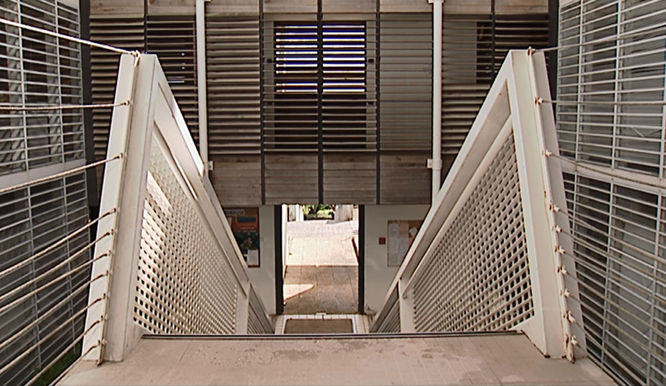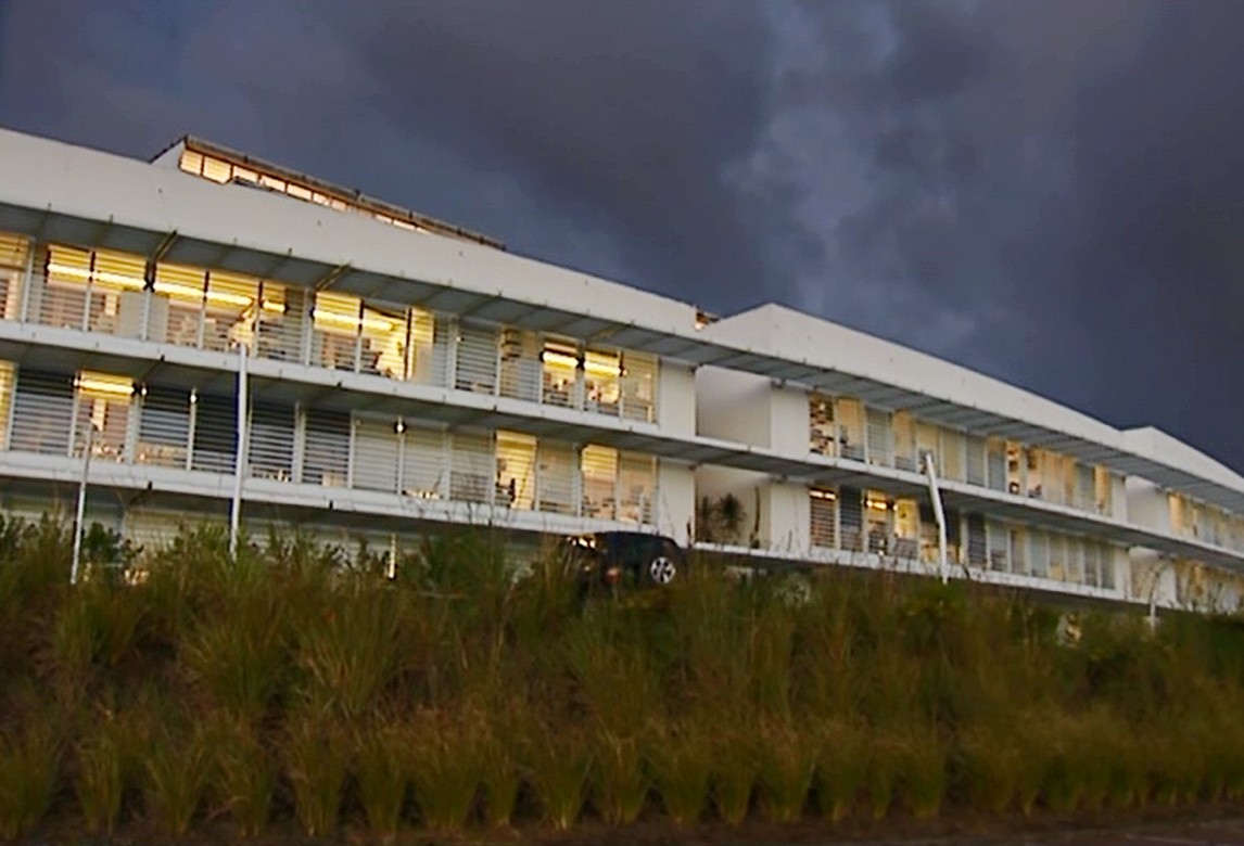 Avec l’alizé continu et puissant qui souffle sous les tropiques, dont l’architecture traditionnelle a su tirer parti, tout s’organise selon qu’on se trouve "au vent" ou "sous le vent" (protégé). L’expérience, jamais tentée pour un immeuble où allaient travailler deux cents personnes, a constitué un pari pour l’architecte. En forme de couronne, la boîte à vent ménage des volets à ouverture variable réglés électriquement pour l’entrée du public, tandis que celle du personnel s’effectue "sous le vent". Cinq patios intérieurs mettent en relation les deux entrées et aident aux appels d’air grâce à des puits grillagés. Contribuant à l’équilibre de l’ensemble, chaque bureau est équipé de jalousies réglables manuellement. Mais le vent, suscitant une belle collection de presse-papiers, l’humidité, la poussière et le bruit rendent la mise en œuvre difficile : les réglages fins ne sont pas faits et le nouveau recteur demande la modification des plans.