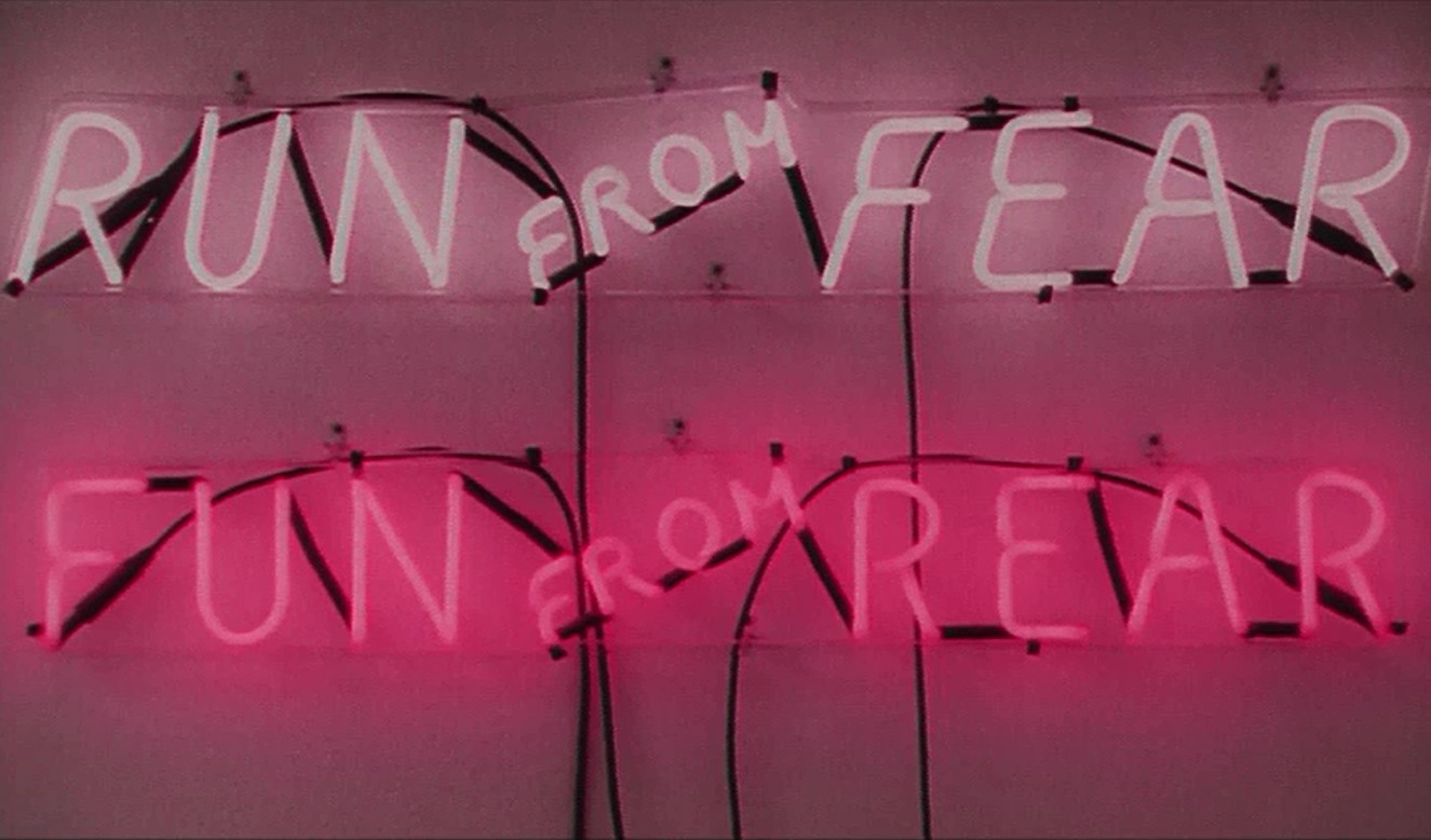 Bruce Nauman (né en 1941) utilise son corps comme instrument d'exploration et de représentation de la réalité humaine, de ses désirs, de ses peurs et de ses frustrations. Dans Poke in the eyes..., il dresse un inventaire minimaliste de gestes quotidiens filmés au ralenti : bouger ses testicules, se mettre le doigt dans l'oeil, etc. Parfois il transfère l'expérience sur des dispositifs plus techniques comme dans Seven Figures où des silhouettes de néons clignotants enchaînent des positions d'accouplement. Néons, installations vidéo ou sonore, son oeuvre intègre régulièrement de nouveaux matériaux . Dans Anthro/Socio, il place le spectateur au milieu des projections sur trois murs d'un visage en gros plan, au crâne rasé, qui hurle des injonctions obsédantes : "Help me, hurt me..."