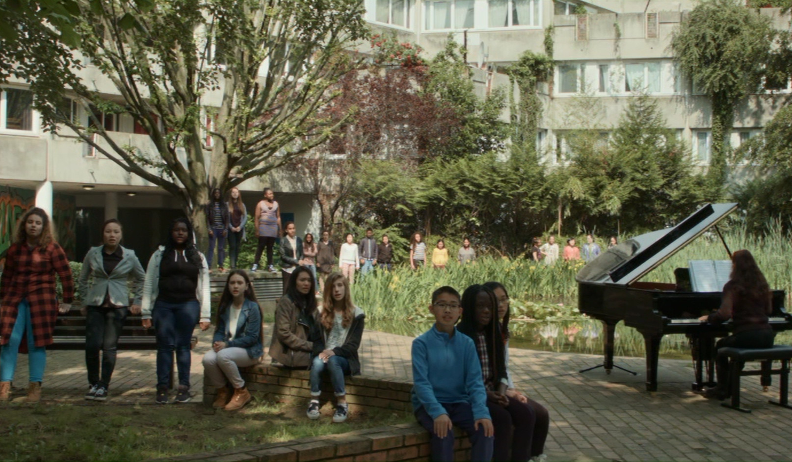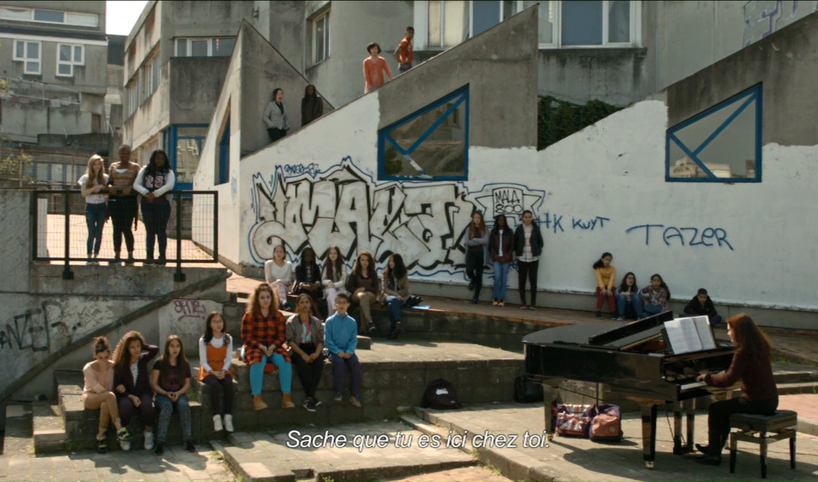 Renée Gailhoustet rêvait d’une architecture où puissent entrer en harmonie l’espace individuel et l’espace collectif. Il suffit de parler d’harmonie pour penser à la musique, et l’espace ouvert par le chant est lui-même un mélange d’intimité et de partage. Les chansons appartiennent à tout le monde et pourtant elles expriment les plus profonds de nos sentiments. Déambuler à la suite des habitants, écouter leurs chants qui viennent des quatre coins du globe, c’est découvrir un territoire familier, une architecture vécue plus qu’un monument. Les formes de la Maladrerie, aujourd’hui délabrée, ses créneaux de béton, ses motifs de brique et ses bow-windows la font ressembler à un vieux manoir anglais. Sa végétation luxuriante, ses pelouses et ses recoins ombragés semblent offrir un décor idéal pour les jeux des enfants. Quelques tags et un caddy bleu échoué dans une mare nous feront-ils croire le contraire ? Le film se libère de tout préjugé pour laisser le regard s’épanouir calmement.