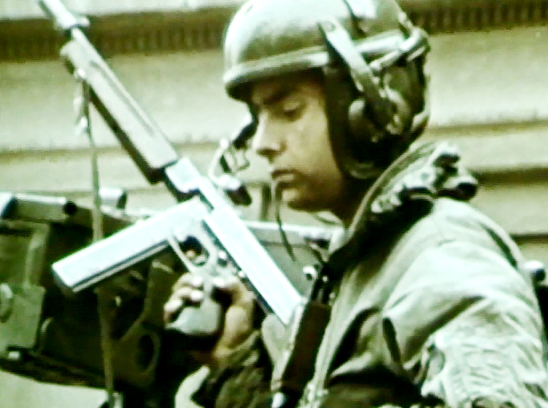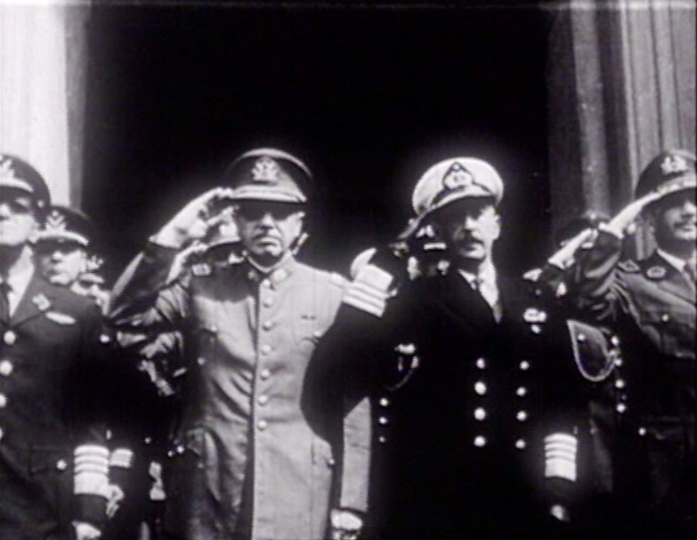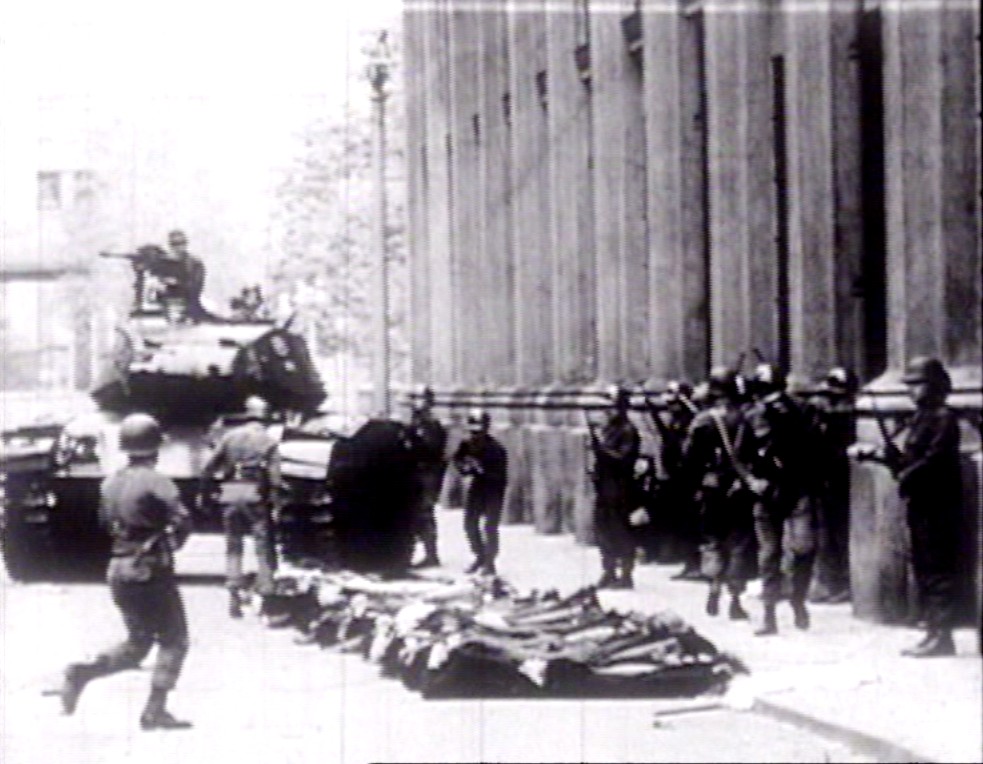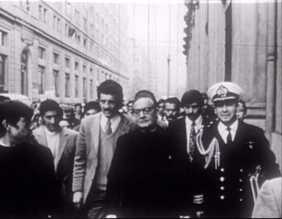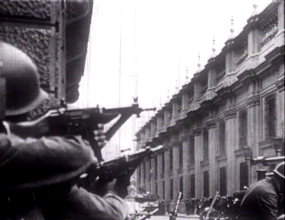 La manifestation des femmes avec leurs casseroles, l'attaque du palais, les militaires dans la capitale, la répression, les enterrements, une dernière fois l'Internationale, le stade, Pinochet et son entourage parmi lequel un cardinal... Les images s'animent, un court instant, pour évoquer les bombardements de sites stratégiques sur la ville. Un narratif se tisse sans didactisme aucun : une manière de vivre et une conscience désormais réprimée s'estompent tandis que les militaires envahissent l'écran. Allende devant la peinture murale d'un poing levé, puis un autre poing qui se lève dans un cimetière, dernières images, symboles d'une mémoire qui ne pourra être effacée.