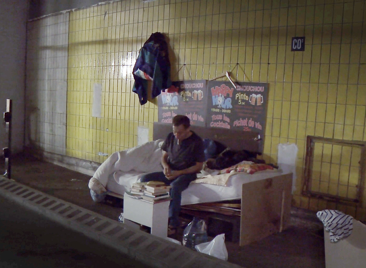 A Paris dans un tunnel autoroutier, des jeunes gens graffent un monumental sécurité globale ?. Ils rencontrent plusieurs personnes qui vivent là dans des abris de fortune ou des recoins de béton ; les discussions s'engagent. Puis le film bifurque et remonte en surface, à la Cantine des Pyrénées dans le XXe arrondissement où des petits déjeuners sont proposés aux SDF.