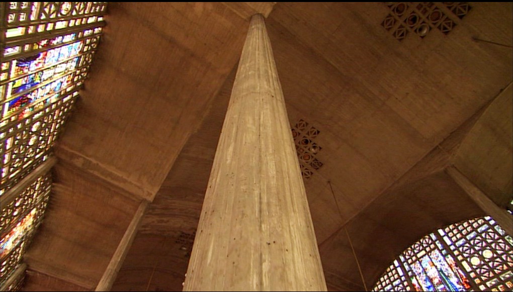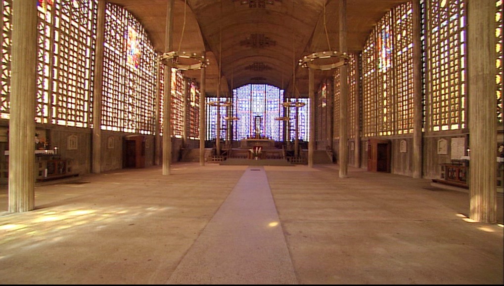 A la fois église paroissiale et mémorial des morts de la bataille de la Marne, l’Eglise du Raincy émerge en 1923, "comme un hangar ou un silo", sur une parcelle en pente et toute en longueur. Ses architectes, rois du béton armé, les frères Auguste et Gustave Perret, vont réaliser en treize mois et pour un budget modeste, une église-halle au plan basilical. L’usage exclusif du béton – du gros œuvre de l’ossature au mobilier - modifie radicalement l’esthétique traditionnelle des bâtiments religieux. La structure détermine ici la forme architecturale : 28 colonnes fines "comme des jambes de girafe" et sans ornement supportent une voûte imposante mais seulement constituée de minces voiles de béton de 3 centimètres d’épaisseur. Dans un souci d’économie de la mise en œuvre, les architectes réutilisent les mêmes coffrages pour l’ensemble des voûtes et des colonnes. Pour les murs entièrement ajourés, 5 séries de claustras préfabriqués permettent de tamiser la lumière colorée inondant l’église.