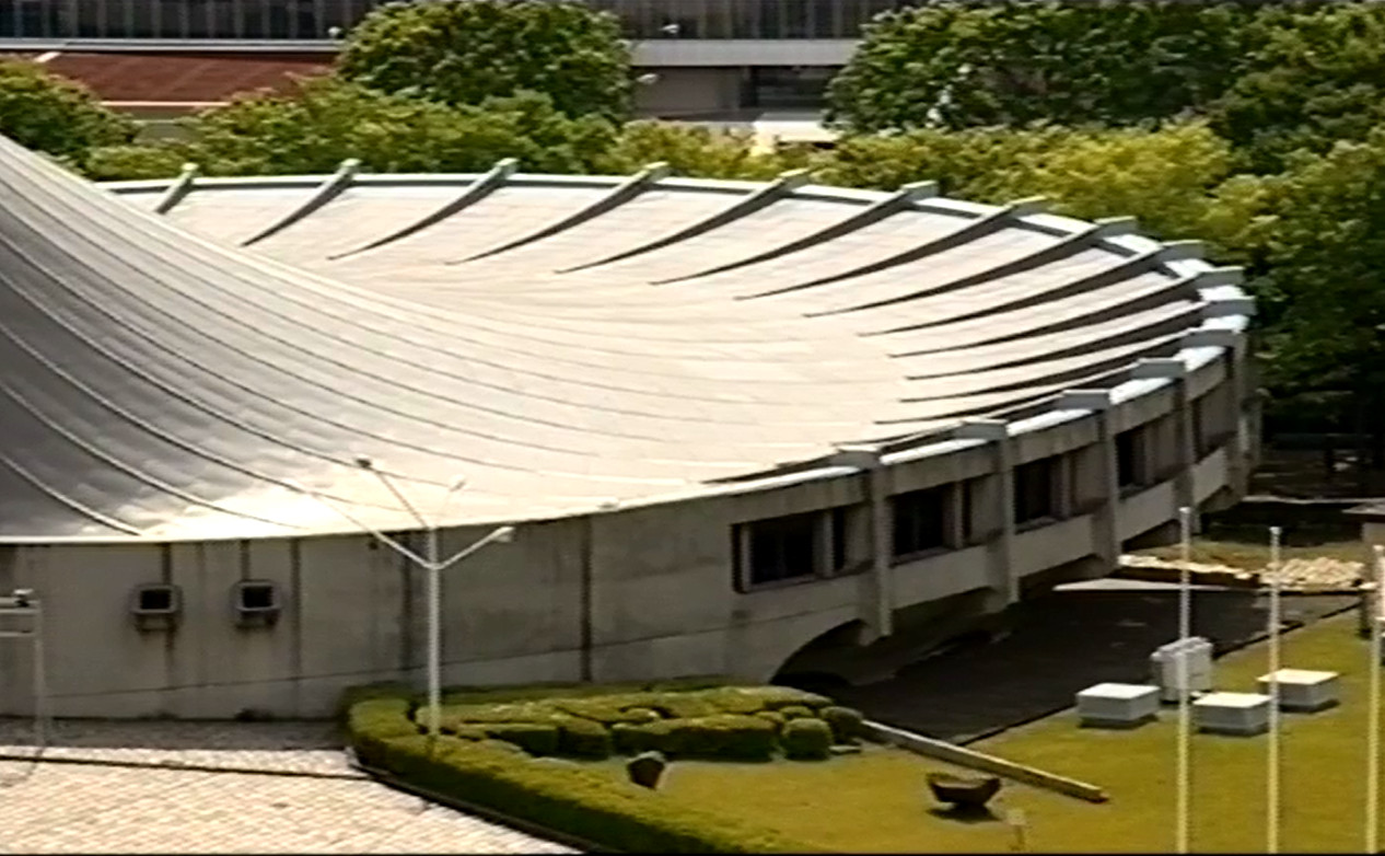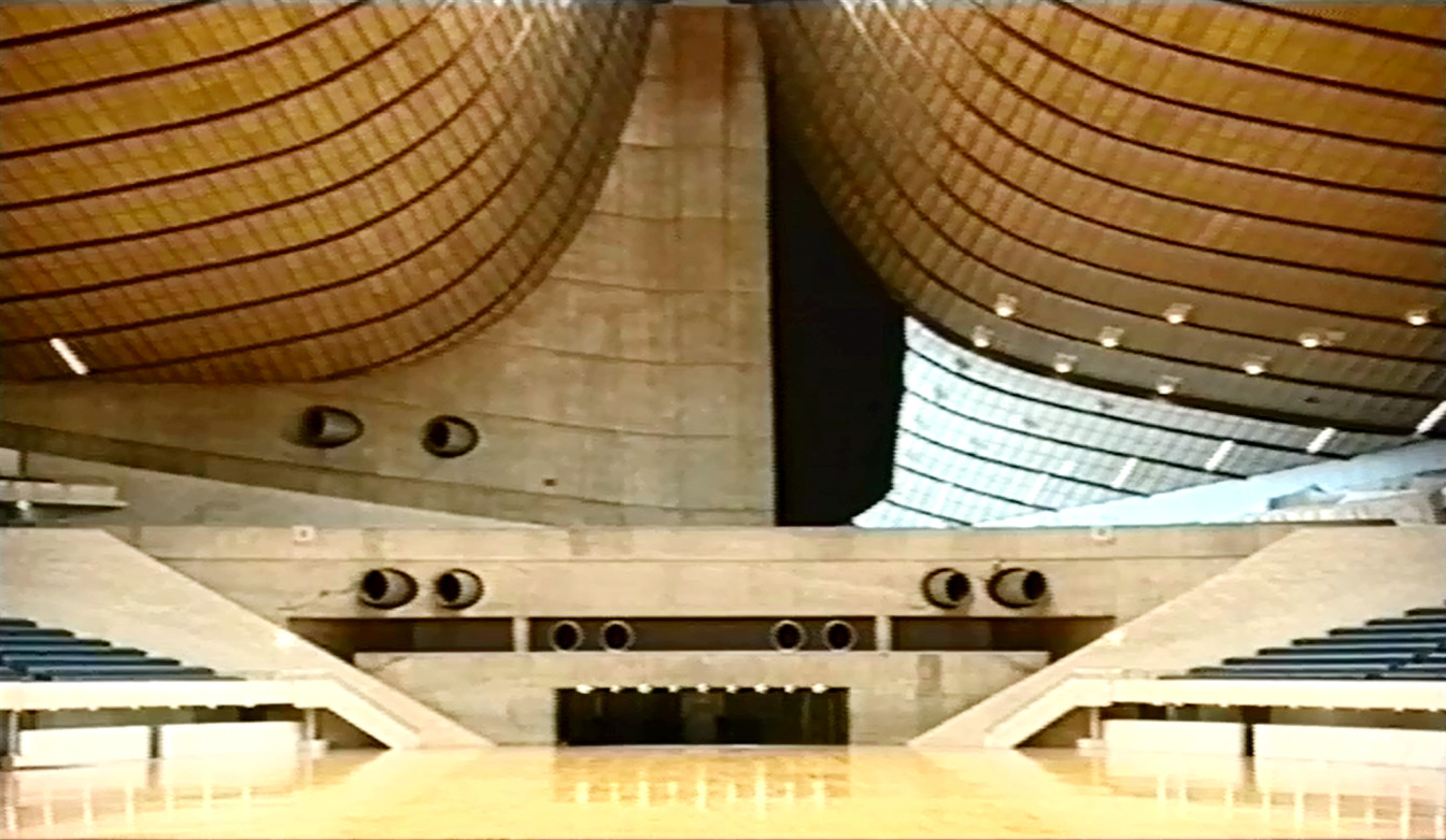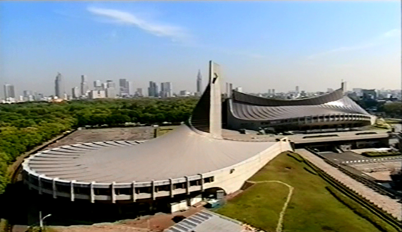 Mêmes principes constructifs issus du pont suspendu pour le grand gymnase des nageurs et le plus petit des basketteurs : un ou deux mâts de béton tendent des câbles d'acier sur lesquels s'accroche une toiture métallique incurvée comme une feuille en suspens. Les formes en revanche diffèrent : grande ellipse pour l'un, petit cercle pour l'autre. Matériau et structure s'exhibent, et Tange revendique la beauté de la fonction. Pour ces formes qui évoquent aussi le navire ou la soucoupe volante, l'architecte se veut sculpteur, et ses créations jouent par contraste avec le profil de la ville. Il conçoit des volumes ouverts là où techniquement cela semble le moins probable : dans l'écartement de deux câbles porteurs jaillit la lumière d'une verrière. Tout est dans la ligne courbe qui suggère, comme un geste, l'accueil et le partage inhérents aux Jeux. Il faut symboliser le sport non par l'illustration mais par l'hymne au mouvement qu'est la structure même du bâti.