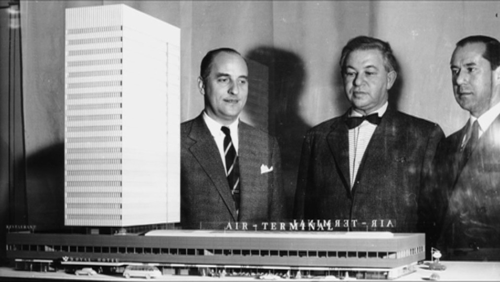 Entre 1956 et 1960, Arne Jacobsen construit à Copenhague un édifice qui devient aussitôt l'emblème de la modernité au Danemark. Pour son programme, d'abord : un terminal d'aéroport en centre ville, mais sans avions, pour enregistrer billets et bagages, et un hôtel attenant. Pour son architecture, ensuite : une tour vitrée de 22 étages, sur un socle horizontal débordant et vert.