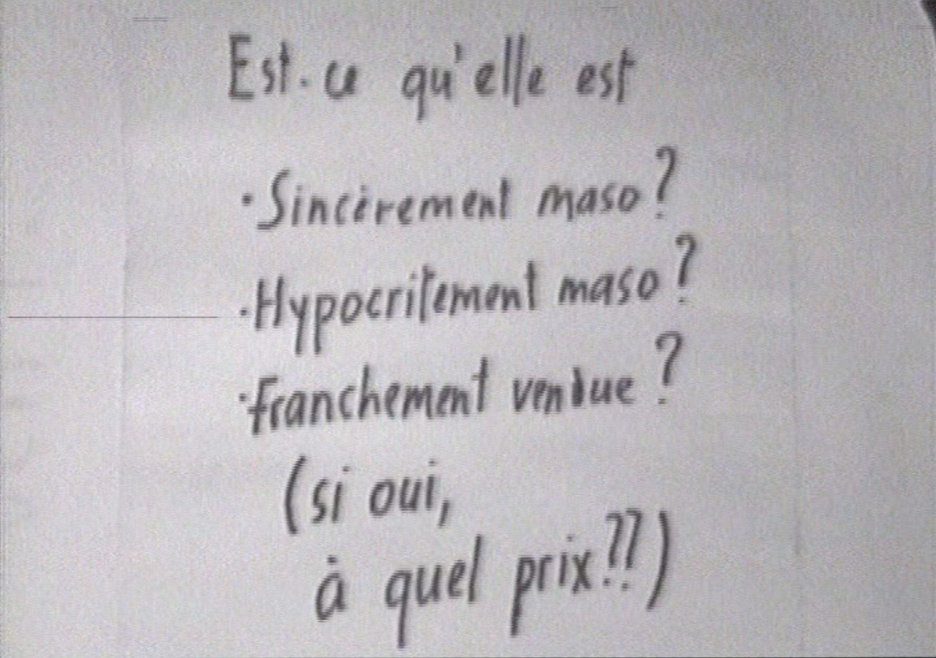 Des cartons donnent les réponses que Françoise Giroud aurait dû donner ; une interview de Simone de Beauvoir contredit ses propos ; les arrêts sur image soulignent son inaptitude. "Notre propos est de montrer qu'aucune femme ne peut représenter toutes les autres femmes au sein d'un gouvernement patriarcal, quel qu'il soit. Elle ne peut qu'incarner la condition féminine oscillant entre la nécessité de plaire (féminisation-maso) et le désir d'accéder au pouvoir (masculinisation-miso). Quant aux réformes proposées par Françoise Giroud, elles peuvent être proposées directement par les ministères concernés (travail, justice, santé...). Aucune image de la télévision ne veut ou ne peut nous refléter, c'est avec la vidéo que nous nous raconterons." Une des premières vidéo scratch en France, une vidéo mythique.