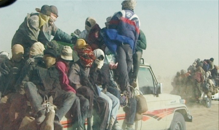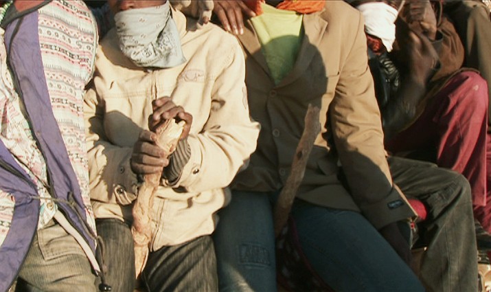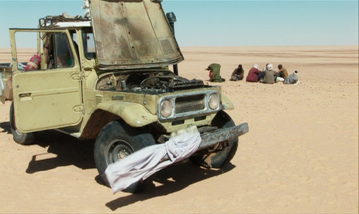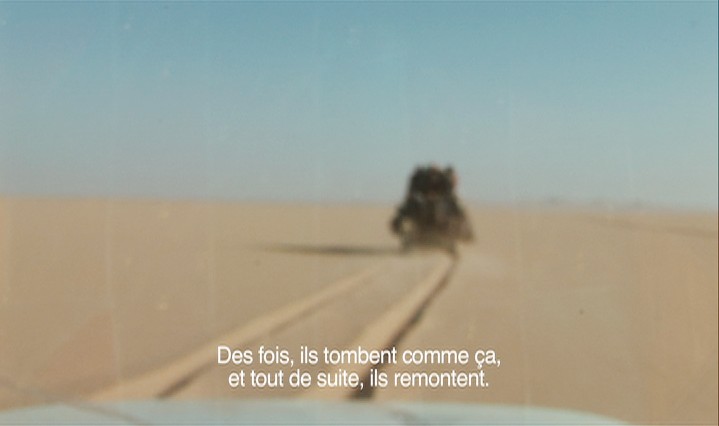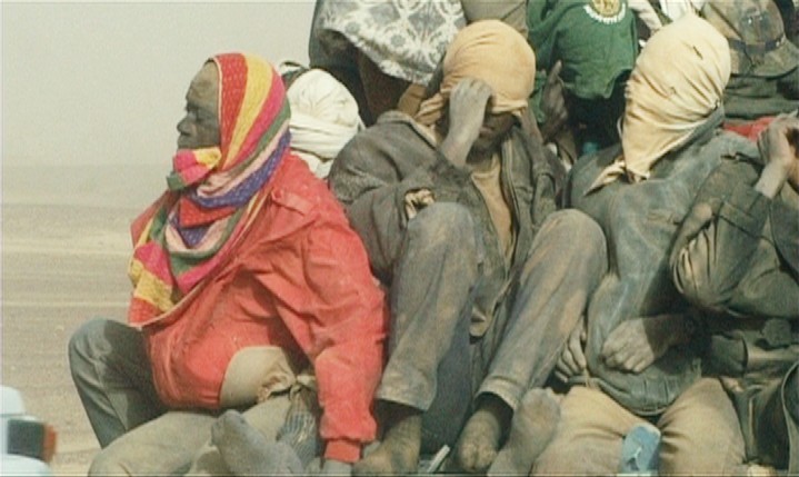 Les mirages du titre désignent tout autant les nappes de chaleur à l’horizon du désert que l’Europe à l’horizon du voyage. Peut-être désignent-ils aussi l’image que poursuit le réalisateur à travers le pare-brise du 4x4 : celle d’une pyramide d’hommes qui tanguent des jours durant au gré de la piste, le visage enveloppé de chèches colorés pour se protéger du sable et du soleil, agrippés pour certains à un simple bâton coincé dans la carrosserie. Cette image défie notre entendement. Plutôt que de l’analyser, d’extirper ce qu’elle contient de drame personnel ou de vérité politique, Olivier Dury tient la distance. Il ne force pas le secret, mais laisse venir à lui les hommes qui l’accueillent dans leur communauté nomade. Sans rien ignorer de l'incertitude de leur sort, il leur rend hommage en laissant apparaître la traversée comme une entreprise collective dont ne sont pas absents, pourtant vite effacés par la fatigue, les moments de joie et d’émerveillement face aux beautés du désert.