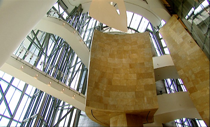 Les interviews de Gehry permettent de reprendre les étapes de conceptualisation du projet. D’abord, des premiers dessins à l’écriture semi-automatique d'où jaillissent des formes fluides comme des poissons tronqués, souvenirs du marché juif de son enfance à Toronto - "nous achetions une carpe vivante que nous mettions dans la baignoire avant que ma grand-mère la tue pour en faire des boulettes". Viennent ensuite des maquettes de petite échelle, ébauches sculptées qui isolent les volumes et évaluent les relations intérieur/extérieur. Enfin, un logiciel utilisé dans l’aviation construit avec rationalité les formes virtuelles des maquettes en carton. Ces images appréhendent peu à peu la fonctionnalité du lieu : trois niveaux d’espaces d’exposition accrochés à un atrium central et monumental. Cette architecture spectaculaire est filmée dans tous ses états météorologiques et les différents points de vue rendent compte de sa position stratégique au croisement d’axes fluviaux et routiers.