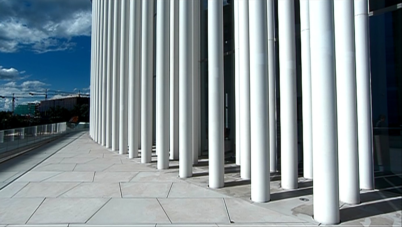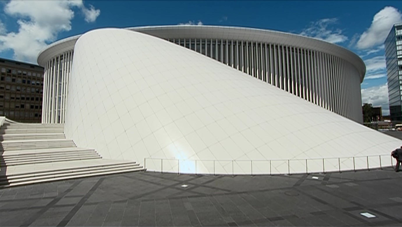 Inaugurée en 2005, la Philharmonie affirme sa monumentalité au cœur d'un nouveau quartier de bureaux. En voix off, Christian de Portzamparc justifie ses choix architecturaux : forme elliptique et façade "filtre" de 823 colonnes d'acier, qui porte la toiture, assure la circulation de l'air et maintient la paroi de verre ; à l'intérieur, une galerie-promenade en spirale et un décor de plâtre constitué de failles et d'obliques qui entoure la salle de concert de 1500 places. Cet auditorium de type shoebox a été conçu avec l'acousticien Yaying Xu : 8 tours de loges sur les côtés, l'étagement des niveaux et les décrochements irréguliers permettent de contrôler la propagation du son ; le choix du mobilier permet sa résonance et son absorption. Dans la salle plus petite dite "de musique de chambre", l'architecte a exploré les qualités acoustiques et volumétriques de la forme "ruban de Möbius" : une surface incurvée dont les deux parois diffusantes privilégient un son multidirectionnel.