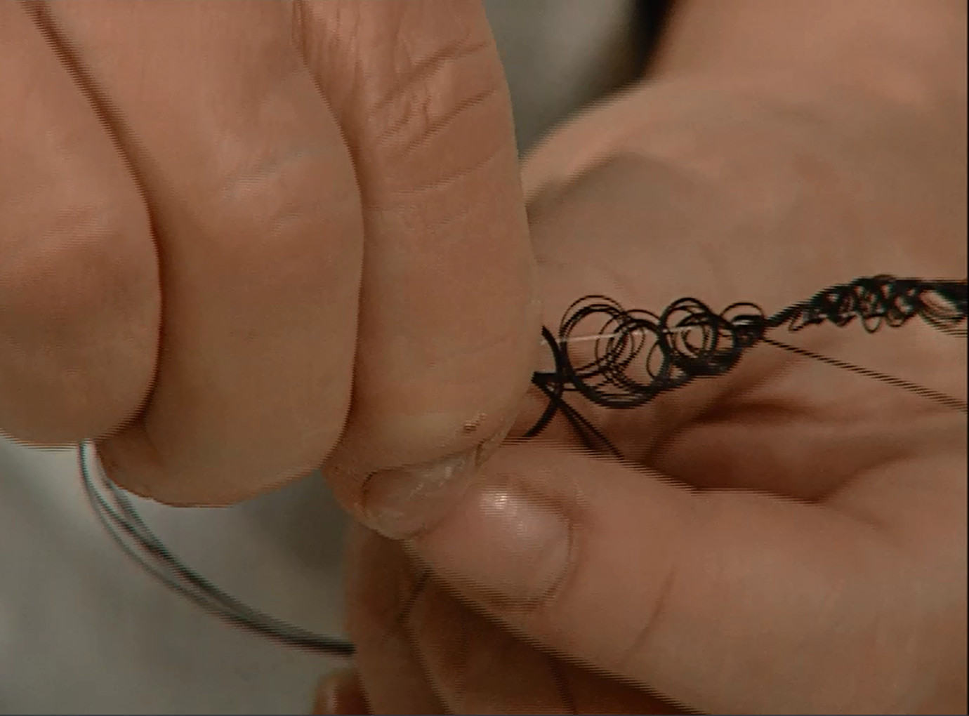 Comme on écrit, Pierrette Bloch remplit de signes de grandes feuilles blanches, le pinceau plus ou moins chargé d'encre, au gré d'un rythme inconscient, d'une respiration : une "écriture sans signification" (mais non sans sens), répétitive, minimaliste. Ses sculptures, également fondées sur le rythme, les ruptures des pleins et des vides, les noirs et les blancs, sont des calligraphies dans l'espace : le crin est noué, enroulé, étiré autour d'un fil horizontal et invisible. Travail lent, répétitif, concentré où les mains lissent, forment, torsadent le matériau souple et rigide à la fois. Le film se clôt par un gros plan sur l'artiste écrivant un poème : la plume sur le papier trace, là encore, des lettres comme des boucles.