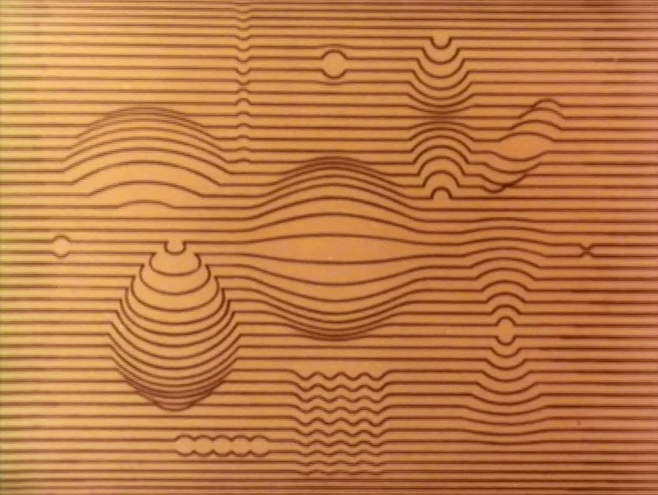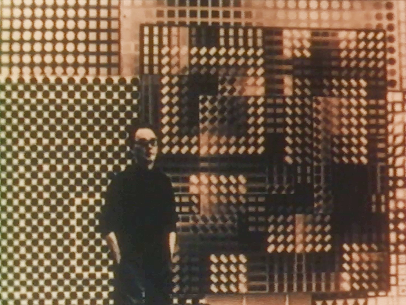 Le support audiovisuel sert remarquablement l'oeuvre de Vasarely, préfiguration frappante des images de synthèse. Son intérêt pour les déformations axonométriques, son évolution vers l'art cinétique et la mise au point de la première génération des multiples se découvrent au fil de ses travaux : analyse des propriétés du trait dans ses oeuvres figuratives des années 1930, découverte du système engendré par les réseaux, combinaison d'épreuves négatives et positives des photographies de ces réseaux, effets lumino-cinétiques et de moirage obtenus à partir des trames d'imprimerie et superposition d'un écran transparent structuré sur un écran opaque contrasté. Pour Vasarely, l'art est une expérimentation syntaxique de formes et de couleurs scientifiquement contrôlables.