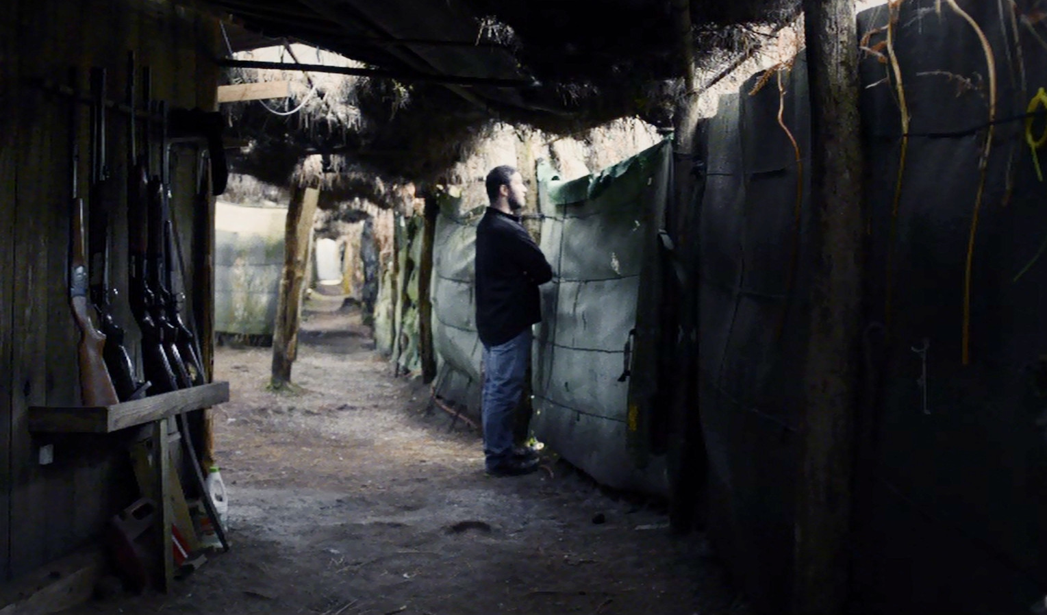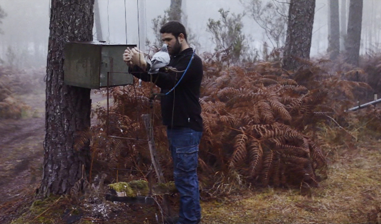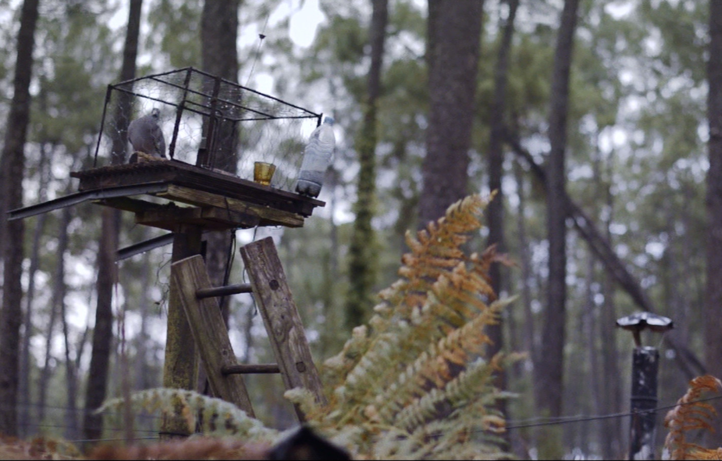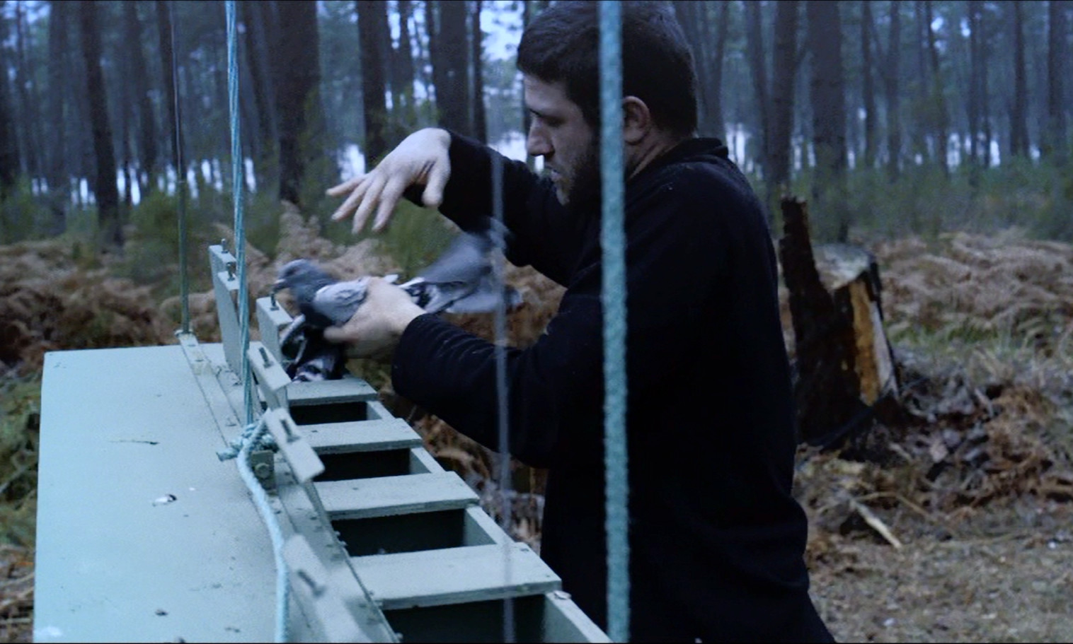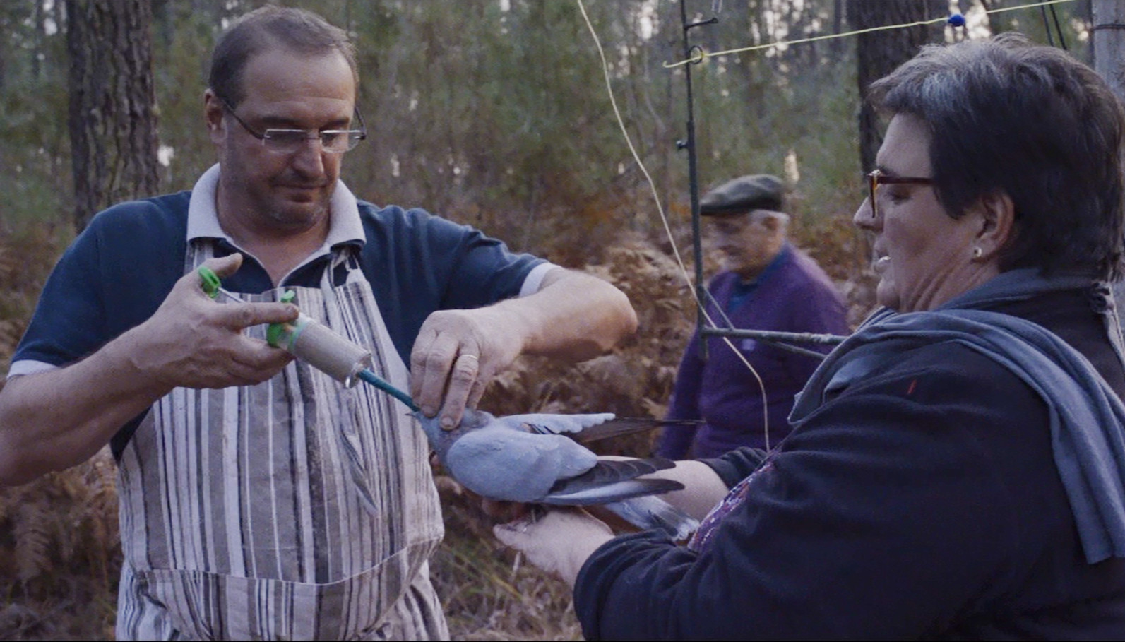 Dès l’aube, à l’heure où blanchit la pinède, des hommes se livrent à un étrange rituel. Lampes frontales vissées sur la tête, ils attachent des pigeons sur des perchoirs puis les hissent jusqu’à la cime des pins. Les proies sont positionnées, l’attente peut commencer. Camouflés dans leur repère, les chasseurs tirent les ficèles d’une étrange installation artisanale, guettant et écoutant les réactions de la forêt. Au loin, des tronçonneuses se font entendre, menaçant leur activité dominicale.