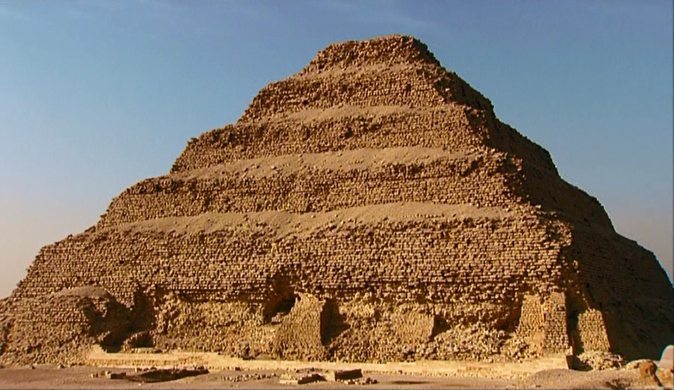 La pyramide à degrés ne naît pas d'emblée. D'abord basse, simple mastaba comme les sépultures royales voisines, elle est surélevée jusqu'à dominer le site de ses 60 mètres. Blocs de calcaire inclinés et niveaux en gradins assurent sa stabilité. Mais le monument révèle aussi une nouvelle conception de la puissance monarchique. Elle s'exprime dans le choix du matériau, la pierre taillée remplaçant l'habituelle brique crue des tombeaux égyptiens. Eternité contre finitude. L'idée contamine tous les espaces : une esplanade bornée permet au mort de réitérer symboliquement le Heb Sed, une course rituelle du pharaon âgé prouvant la pérennité de sa vigueur. Des chapelles factices reproduisent celles, provisoires, érigées pour ces fêtes. Sous terre, le défunt dispose de stocks pour l'Au-delà, et son palais en simulacre se veut l'expression de la permanence de son pouvoir. Ce que traduit aussi tout l'ensemble qui imite, en l'adaptant à la pierre, l'architecture végétale traditionnelle.
