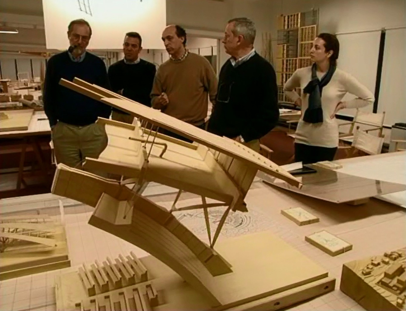 L'atelier de Punta Nave, sur la côte génoise, est une immense serre de verre qui épouse la pente de la colline jusqu'à la mer. Renzo Piano y est saisi en dialogue avec ses collaborateurs, à propos d'une exposition que le Centre Georges Pompidou doit lui consacrer. Comment recréer l'agence dans un musée ? Comment rendre compte de la complexité d'un projet architectural, "résultat de l'art, de la science, de la sociologie, de l'anthropologie, comme une bouillabaisse où tout vit ensemble" ? Piano est avant tout un homme de chantiers : il enchaîne les réunions avec plaisir, sait convaincre ses détracteurs avec humour. Par exemple, dans le projet du centre commercial de Nola, en Campanie, "un petit Vésuve de 40 mètres de haut" dont le cratère abrite un hypermarché autour d'une place-jardin de 160 mètres de diamètre, comment inciter les financeurs à accepter l'espace considéré comme "perdu" ? La réponse est elliptique : "Sans le jardin, cet ensemble devient une série B !"