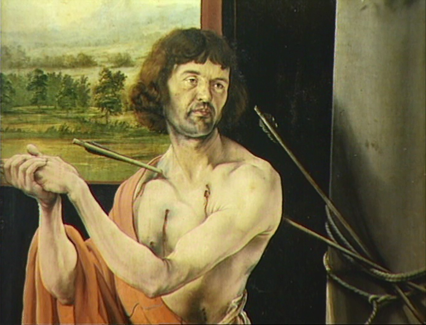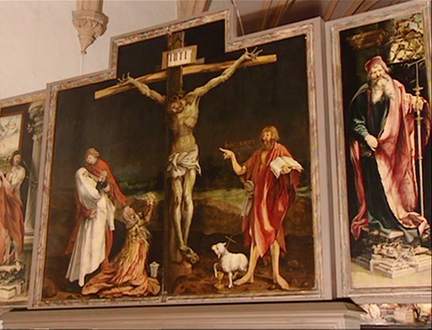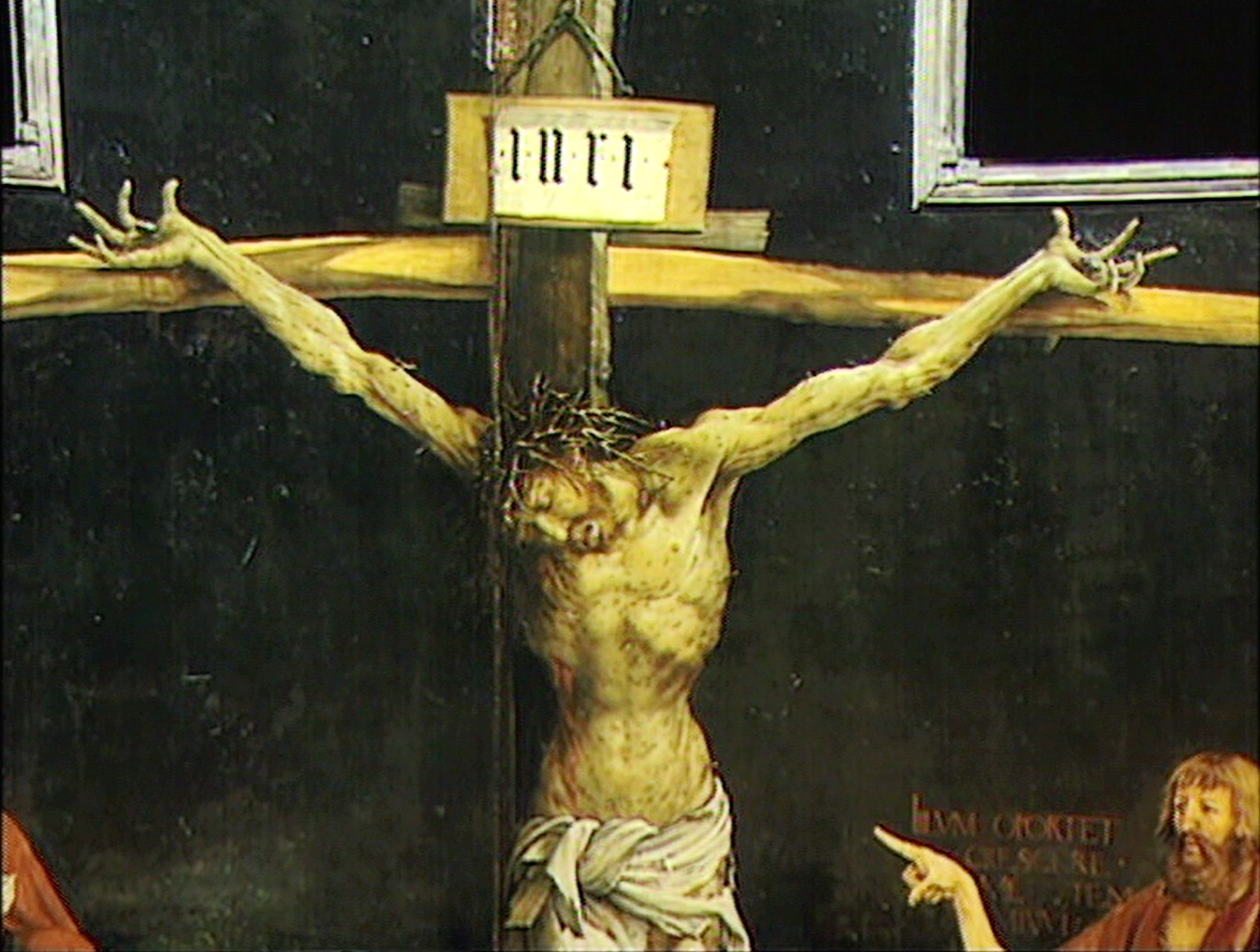 Ce retable est celui de la chair meurtrie et de la chair transfigurée. Stimulé par ses commanditaires, le peintre crée un Christ en croix au corps criblé des plaies de la flagellation et aux mains effroyablement crispées. Dans la Tentation de Saint Antoine où des monstres animalesques tentent de dévêtir le pauvre ermite, il place un être grotesque à moignons, dont la peau bourgeonne de pustules et autres chancres ; en concentrant sur lui les symptômes les plus terribles, ce personnage incarne le malade. Lui aussi saisit le manteau d'Antoine, mais il cherche plutôt les vertus thérapeutiques associées à ce tissu. Si des guérisons pouvaient se produire grâce à une meilleure nutrition et aux amputations, c'est aussi un soulagement mystique que visaient les Antonins. La chair blessée du Crucifié montre au malade que ses souffrances répètent celle du Christ et elle l'aide à espérer le Salut. La Transfiguration lui promet une fusion dans la lumière divine où cesse toute douleur.