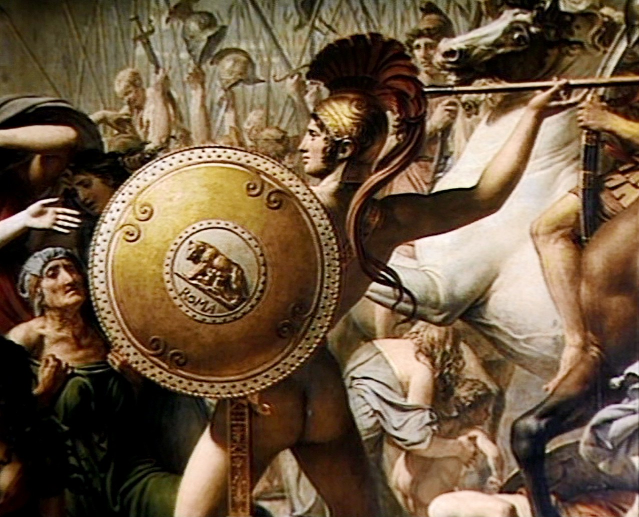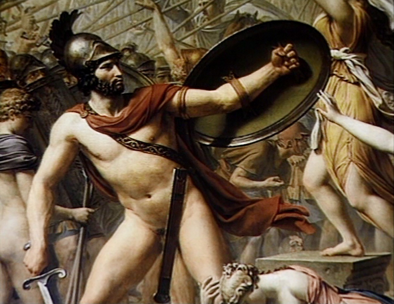 La longue élaboration, la fabrication d’accessoires à l’antique, la multitude de dessins, les séances de pose des élèves pour le maître trahissent l’importance de ce tableau pour son auteur. Au lieu de l’enlèvement de leurs voisines par les Romains selon l’iconographie traditionnelle, David a préféré peindre le moment où les Sabines s’interposent pour faire cesser la guerre entre leurs ravisseurs et leurs parents. Tout est dans le tumulte figé par le geste péremptoire d’Hersilie, épouse de Romulus. David crée des types : les corps virils nus mais armés ne sont plus invraisemblables dès lors qu’ils incarnent l’esprit héroïque des Grecs construisant la Cité, et peu importe que le thème soit romain, c'est de réconciliation nationale qu'il s'agit. Car David a pris une part active à la violence qui a précédé la mise en place de la République, et les regards effrayés qui fixent ici le spectateur renvoient à la responsablité de chacun, y compris celle du peintre, dans le cours des événements.