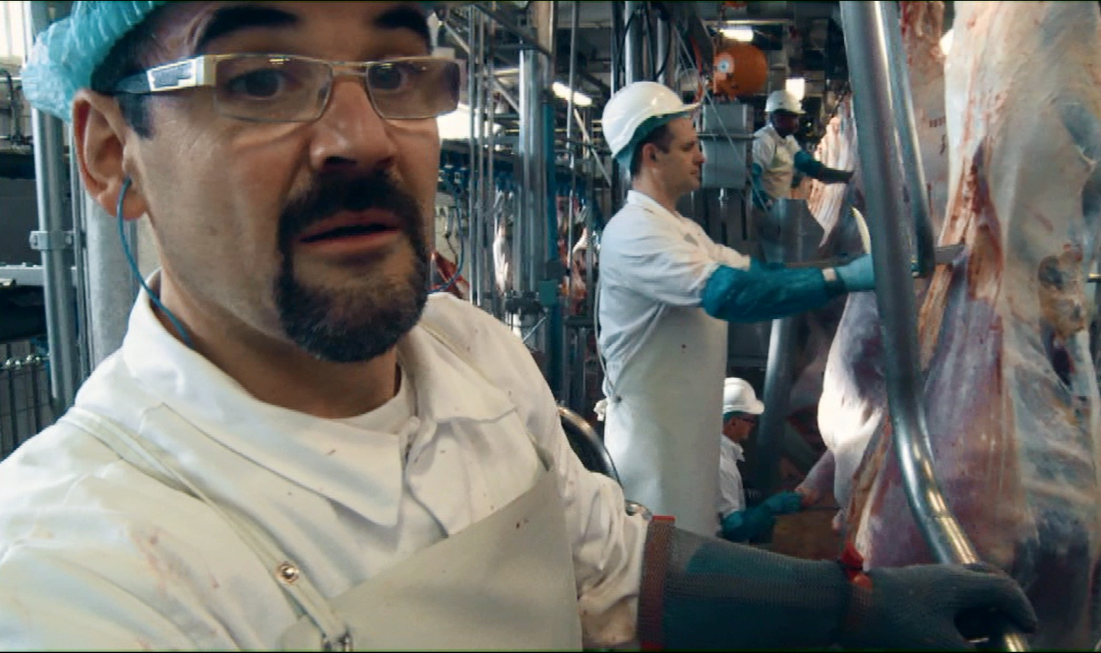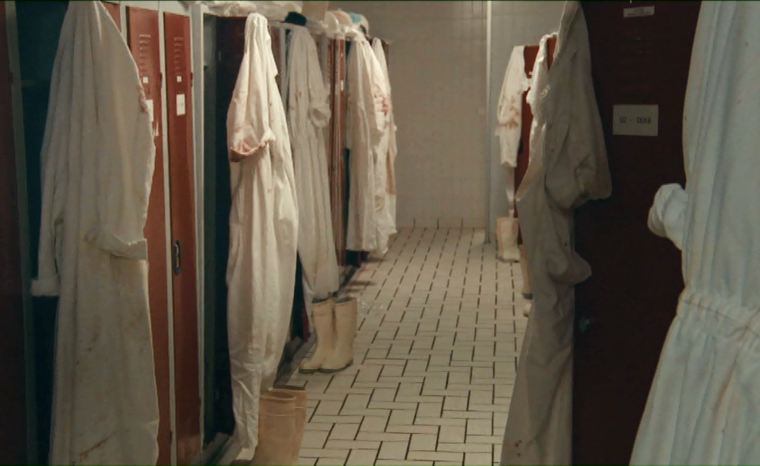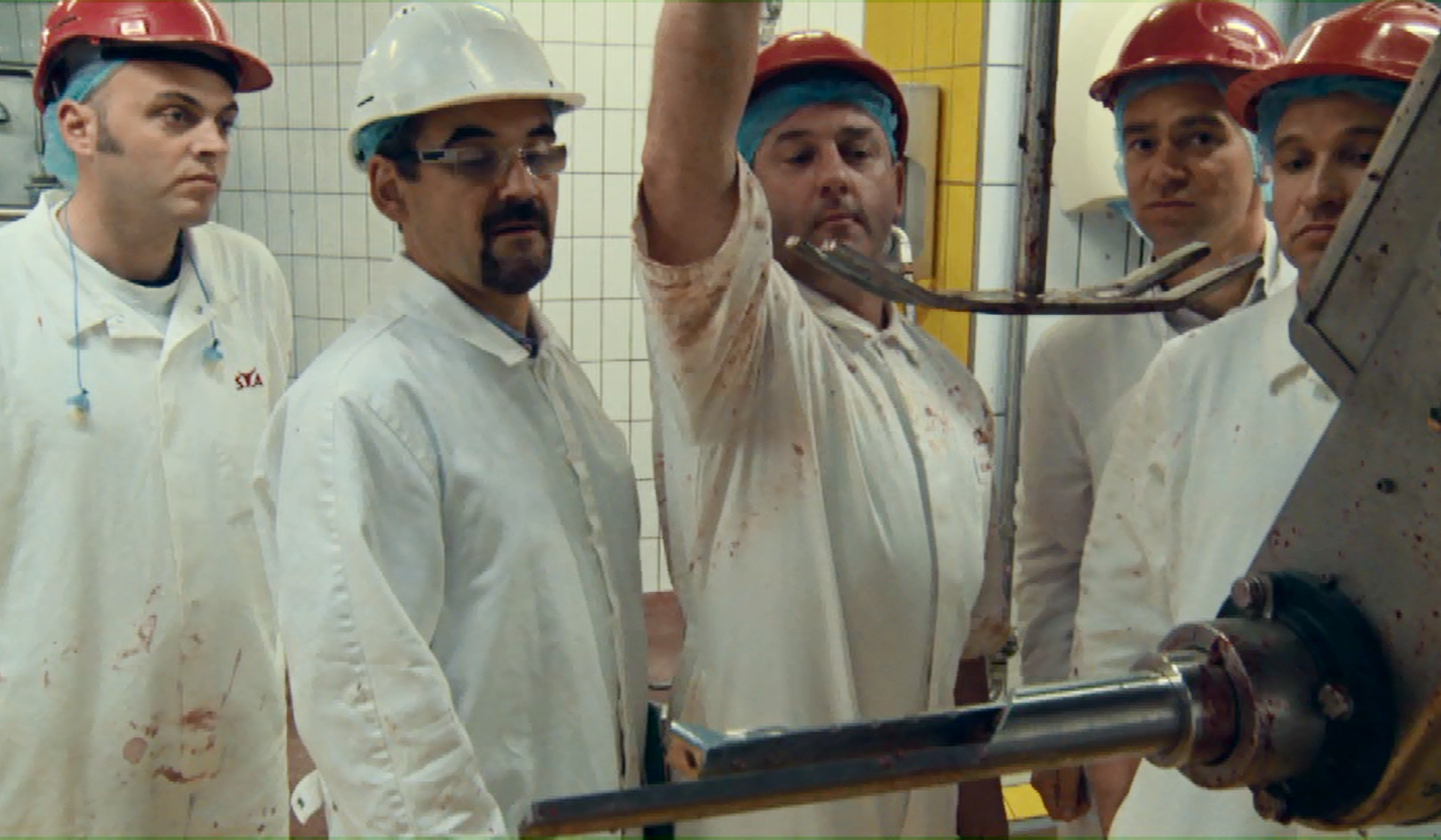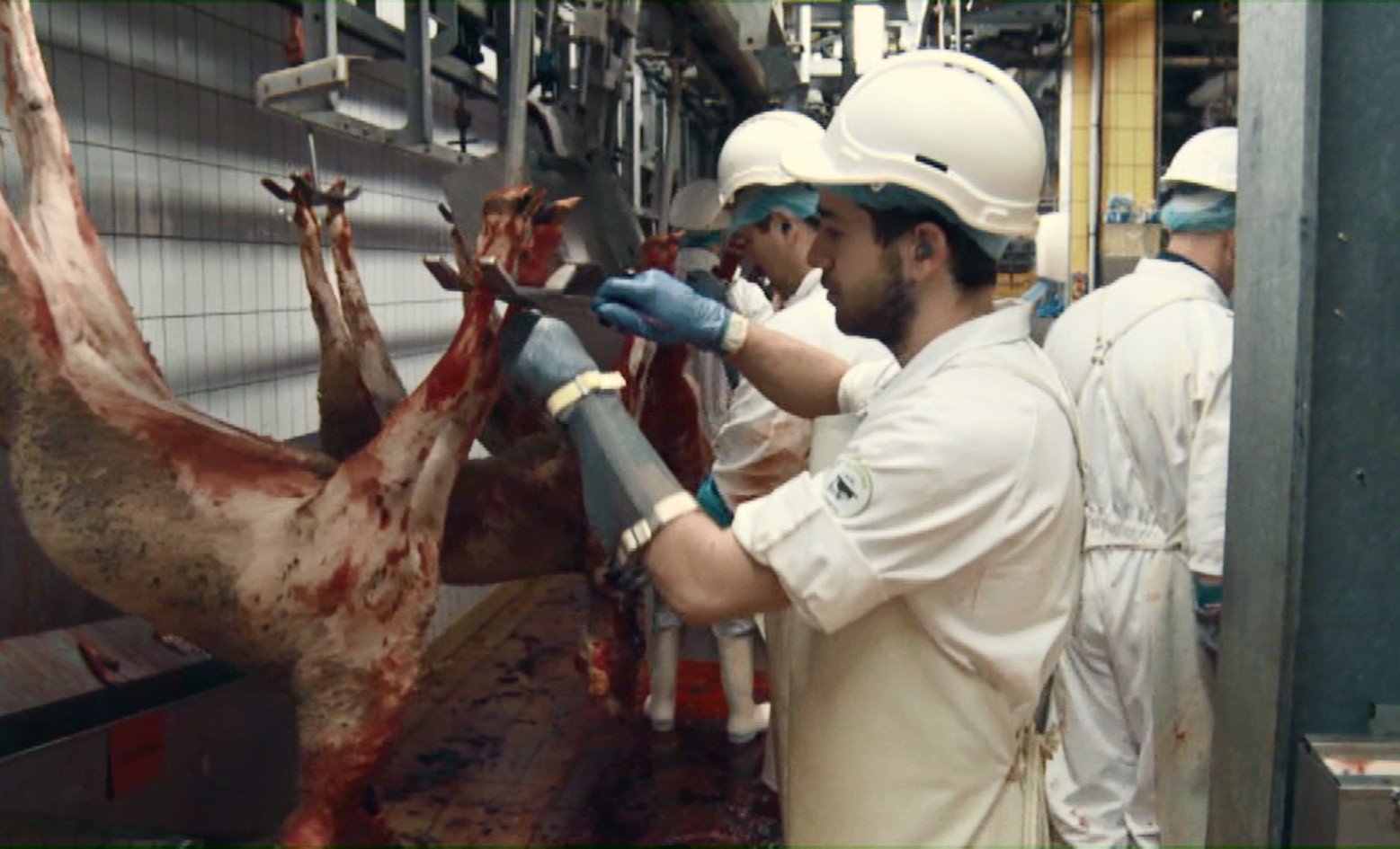 Le film débute par quelques minutes d'échauffement d'un ouvrier sur son poste de travail, scène que l'on retrouve tout au long du film, signe que le travail nécessite qu'on soigne sa condition physique. Dans cet environnement très masculin, pour Steven, Simon, Yohan, Aboubacar, Isabelle et les autres, les pauses sont chronométrées. Les accidents du travail ne sont pas rares. Les gestes de chacun sont constamment surveillés, tant par soucis de sécurité que de productivité. Le délégué du personnel passe en revue les installations, s’efforçant de faire reconnaître la pénibilité de certains postes auprès de la hiérarchie. "Je vois des personnes qu’on met à la porte parce qu’elles ont les épaules bousillées. La dernière en date avait 35 ans et elle aura des douleurs jusqu’à la fin de ses jours." L'environnement sonore - crissements des lames contre les fusils à aiguiser, entrechoquement des crochets métalliques, chaînes et cisailles - n’en fait pas moins oublier la sensibilité des ouvriers vis-à-vis des carcasses animales qu'ils manipulent. "J’ai un ami, il a fait une semaine et demie et il est reparti. C’est pas donné à tout le monde. Il avait du mal à manger de la viande après."