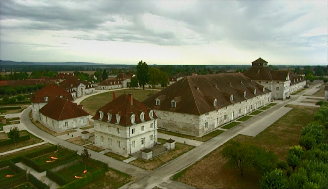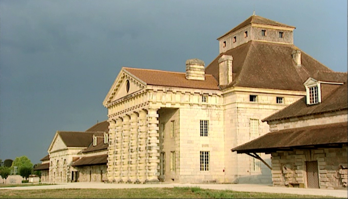 Construites entre 1775 et 1779 dans le Doubs, en lisière de la forêt de Chaux et à proximité de la Loue, les unités de cette saline royale ont été conçues avec tous les services nécessaires à la production industrielle. Sur un arc de cercle, de chaque côté du pavillon d’entrée, s’alignent la maréchalerie, la tonnellerie et deux bâtiments d’habitations pour les ouvriers avec jardins à l’arrière. Sur l'axe refermant l'hémicycle, la maison du directeur est placée au centre, bordée par les bâtiments de production. Le plan de cette ville fermée par un haut mur définit un espace aussi fonctionnel (hygiène et sécurité) que hiérarchisé. La perspective axiale relie l'entrée - une colonnade dorique protégeant une grotte aux roches brutes - à la maison du directeur avec son péristyle colossal, que domine l’oculus du fronton. Aujourd’hui, la saline a été transformée en centre culturel, qui abrite désormais les rêves de papier de Claude-Nicolas Ledoux.