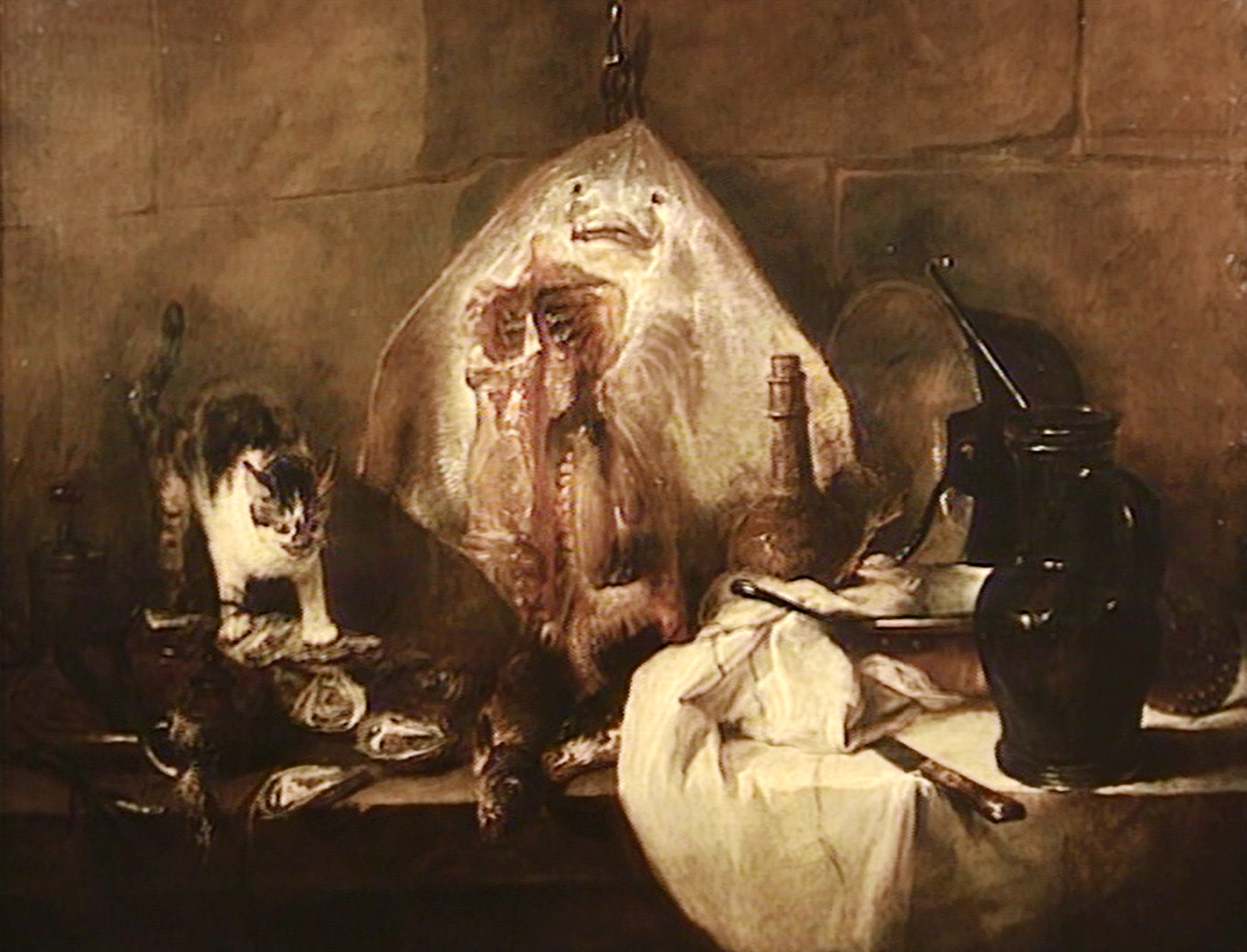 Après un bref historique du genre "nature morte" depuis l'antiquité égyptienne jusqu'aux peintres flamands qui lui donnèrent ses lettres de noblesse, Alain Jaubert esquisse à grands traits le portrait et la carrière de Chardin (1699-1779), peintre de scènes de genre et de natures mortes dans lesquelles sont mis en scène les objets les plus ordinaires. Il fait appel à la palette graphique pour étudier la composition de La Raie et pour reconstituer son élaboration. Ayant montré la séparation du vivant et de l'inanimé, du cru et du cuit, le réalisateur révèle la dimension sauvage, mais cachée, de la raie, devenue modèle emblématique de Chardin. Eventrée et sanglante, c'est elle qui confère au tableau toute la violence d'une scène historique.