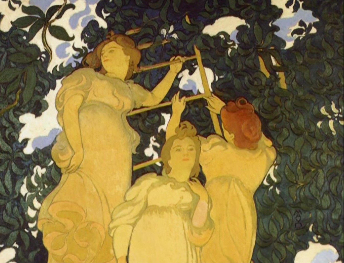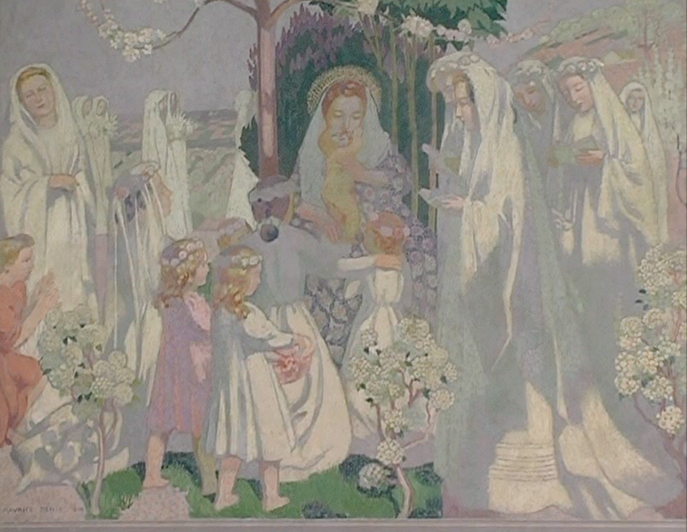 Avec les Nabis marqués par Gauguin, Denis refuse d'emblée le réalisme pour la simplification synthétique des formes. La peinture est pour lui "une surface plane recouverte de couleurs" ordonnées, théorie qui s'accorde avec ses aspirations symbolistes. Il est vite reconnu pour ses talents de décorateur. Dans l'intimité d'un intérieur privé ou dans l'apparat du théâtre des Champs-Élysées, sa peinture profane confine au sacré. Teintes pastel ou nacrées auréolent d'éternité la Jeunesse ou la Musique, qui passent du mythe à des incarnations contemporaines. Idem dans la peinture religieuse : la nombreuse famille de Denis figure sur les décorations de l'église Saint-Paul de Genève et de leur chapelle privée à Saint-Germain-en-Laye ; ses amis peintres donnent leurs visages aux apôtres de l'église du Vésinet. Profondément croyant, Denis fonde en 1919 les Ateliers d'art sacré pour la formation de ceux qui œuvreront avec lui à la reconstruction des églises après-guerre.