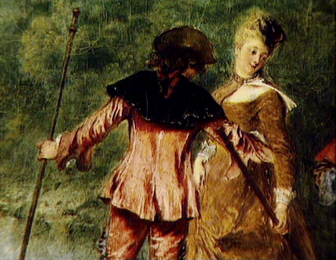 Portant le bâton des pèlerins et le mantelet des voyageurs, les couples de cette farandole bucolique rendent hommage à Vénus près d’une barque à proue en coquille. Leur évolution représente-t-elle les trois stades de l’amour selon les Anciens : persuasion, consentement, harmonie ? L’artiste les croque par petites touches rapides et emprunte une riche variété de tons aux Vénitiens. Cependant, le théâtre est sa grande source d’inspiration. Les plans rappellent les décors à coulisse ; la tenue du mezzetin est typique de la Commedia dell’arte. Peut-être est-ce même l’illustration d’une comédie dont le divertissement final invite au pèlerinage à Cythère, thème qui gagne alors tous les arts, tel Le Carillon de Cythère de Couperin. Watteau l’évoque souvent, notamment dans L’Île enchantée. Le relâchement de l’ordre moral sous la régence de Philippe d’Orléans peut expliquer cet engouement, reflet de l’éclosion de cercles libertins prônant la sensualité.