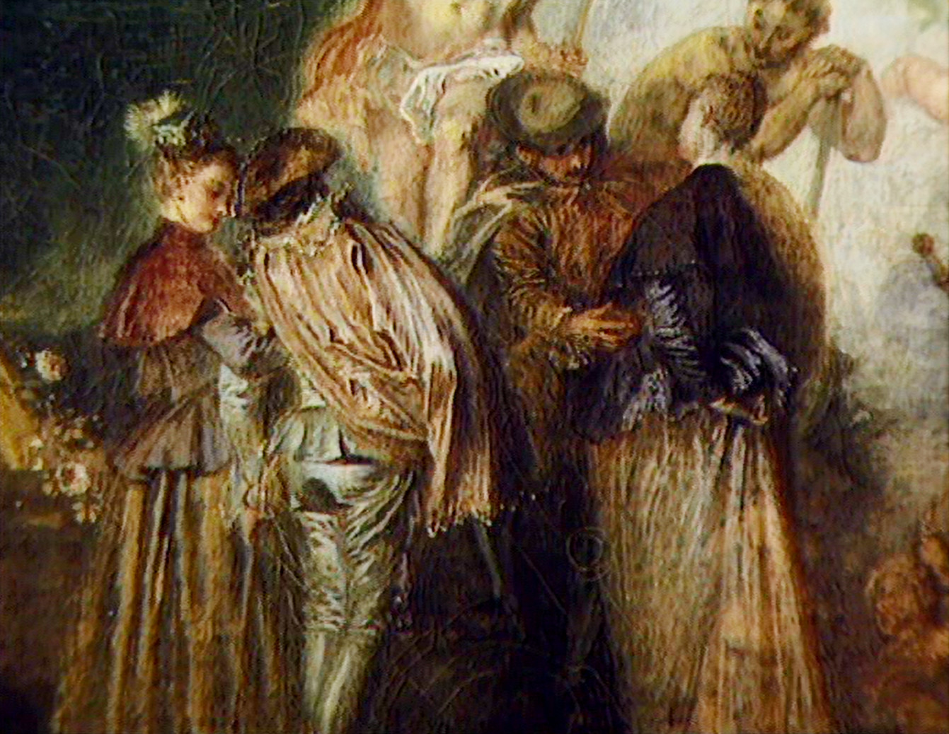 Dénommé Fête galante au lieu de Pèlerinage à l'île de Cythère dès sa réception à l’Académie royale de peinture de Paris, sans doute pour que le jeune virtuose n’ait pas les honneurs dus aux peintres d’Histoire, ce tableau de 1717 a ensuite été considéré telle sa "réplique" de Berlin comme un Embarquement. Il a retrouvé son titre d'origine près d'un siècle et demi après. Mais mythologique ou non, c’est bien d’amour qu’il s’agit.