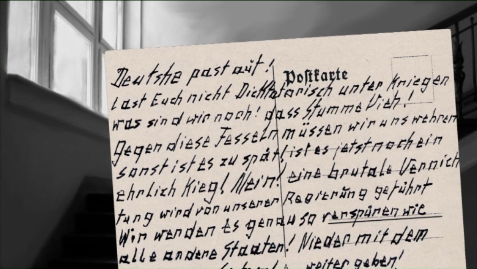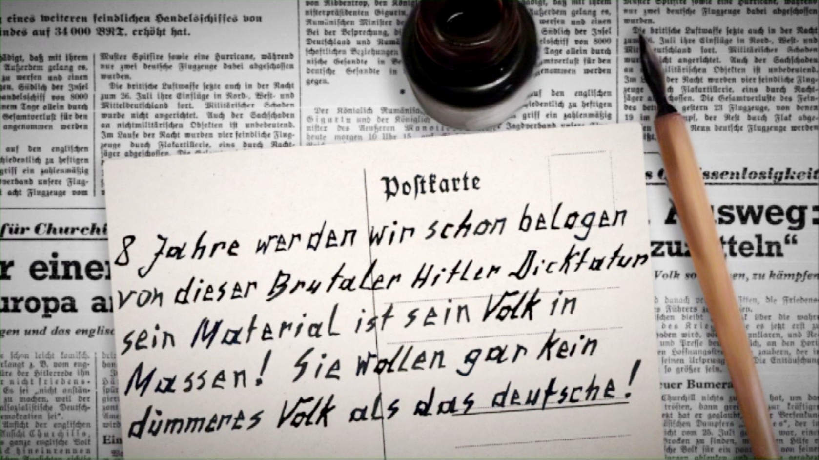 "Faites circuler", ainsi Otto Hampel conclut-il les cartes qu'il dépose avec l'aide de sa femme dans les immeubles berlinois, fin 1940, avec l'espoir que ces petits pamphlets, gouttes d'eau dans un océan pro-nazi, finiront par essaimer dans tous les esprits. Pendant deux ans, alors que la situation se dégrade inexorablement, que le rationnement alimentaire se fait plus rigoureux, que les bombardements s'intensifient et que le moral de la population s'effondre, les cartes appellent sans relâche à renverser "Hitler et sa clique". Un activisme suffisant pour inquiéter la Gestapo puis les SS, qui se lancent aux trousses des mystérieux agitateurs. Qui étaient les Hampel ? Quels étaient leurs mobiles ? Espéraient-ils réellement renverser tout un régime avec des cartes postales ? Comme le résume la voix off de Jacques Bonnaffé, cette histoire prouve au moins qu'"il était possible, malgré la désinformation généralisée, de regarder la réalité en face, [d'avoir] le courage d'ouvrir les yeux".