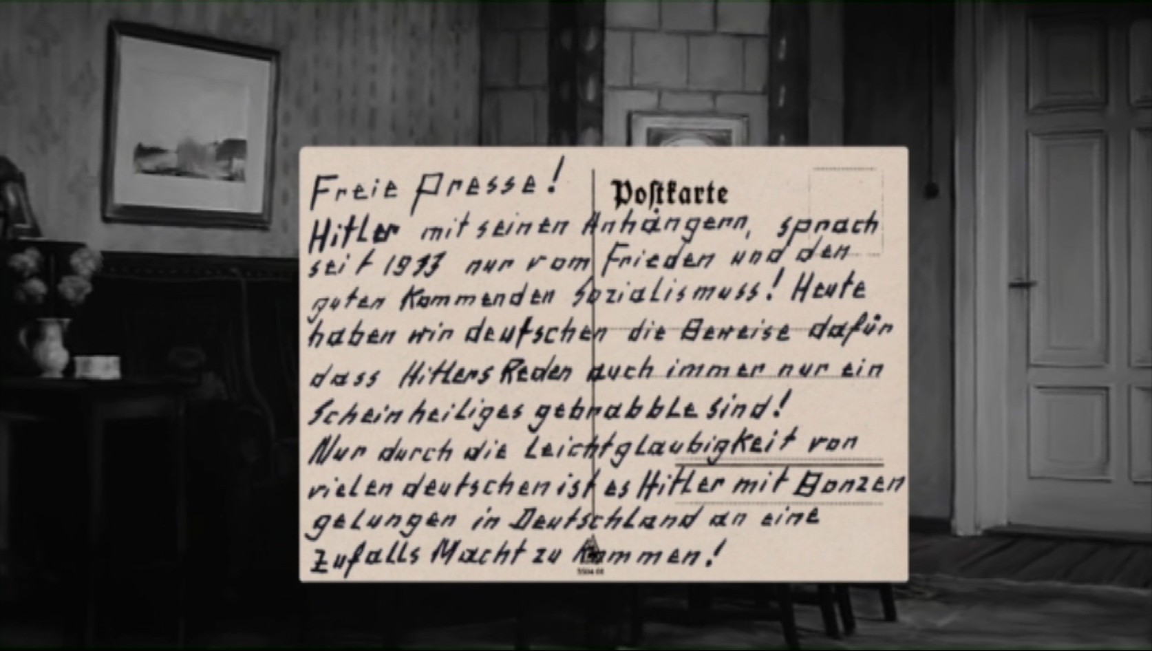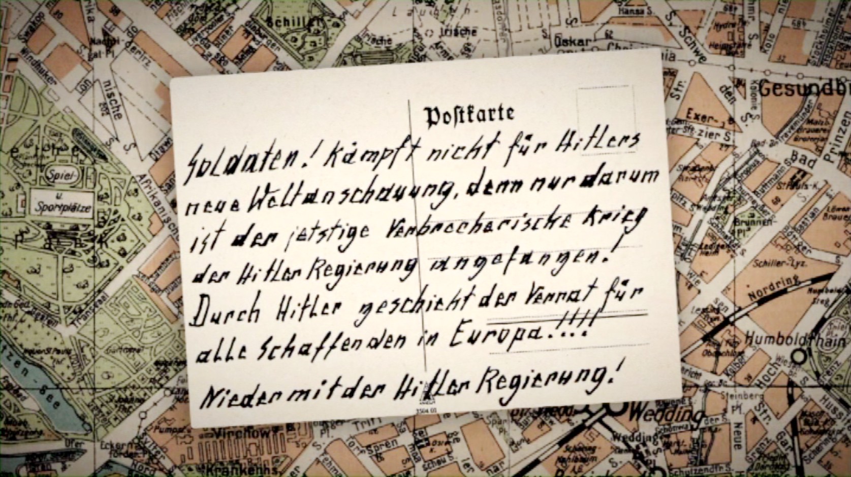 Seuls contre un peuple tout entier acquis à la cause hitlérienne, Otto et Elise Hampel entrent en résistance en employant une méthode aussi singulière que dérisoire : déposer aléatoirement dans Berlin des cartes postales anti-nazies révélant le vrai visage du IIIe Reich. En plongeant dans les archives de la Gestapo et par le biais d'extraits de films de fiction, Michaël Gaumnitz dessine en creux un portrait de la vie berlinoise à cette période.