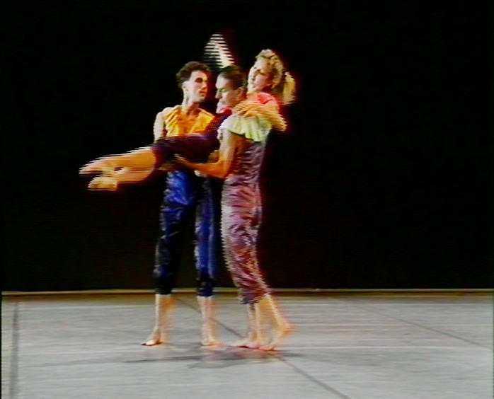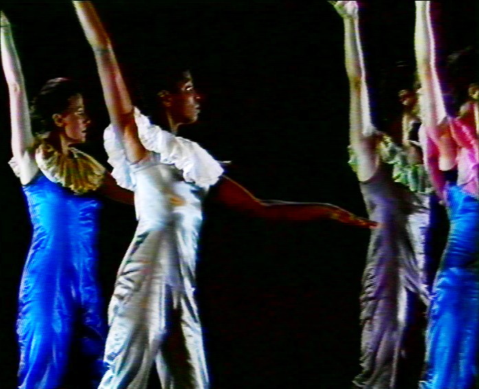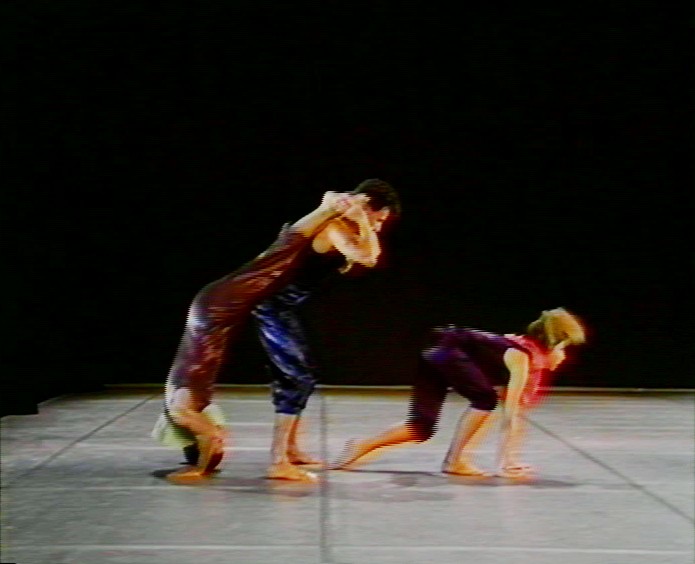 Pleure (extrait de Sous la blafarde, 1987, 3', couleur. Réalisation : Arnaud Dauphin). La séquence dite "du tango" de Sous la blafarde a été remontée dans le cadre d’une courte résidence de la compagnie, au cours de l’été 1987, au Centre de rencontres de Châteauvallon dans le Var, dont la mission était à l'époque, en tant que Théâtre national de la danse et de l'image, de favoriser la rencontre du cinéma et de la vidéo avec la danse vivante. Etaient ainsi accueillis des étudiants de La Fémis (dont Arnaud Dauphin), qui filmèrent outre ces trois minutes, des extraits d'Assaï (cf. vol.14), pièce par ailleurs présentée dans le cadre du festival de Châteauvallon. Ce sont les stagiaires et les nouveaux danseurs de la compagnie, parmi lesquels Priscilla Danton, qui interprètent ce fameux tango, façon de défilé espiègle qui s’achève en fresque. Des interprètes d'origine ne reste que Sylvie Giron. L'un des intérêts de cette courte séquence est que Dominique Bagouet y danse lui-même. Plusieurs éléments transforment cependant sensiblement l'ambiance du spectacle enregistré en 1980 : la prise de vue couleur qui fait apparaître le bariolage satiné des costumes, la proximité de la caméra qui permet de voir la danse dans tous ses détails, le plein feu des lumières, enfin, qui contribue à éliminer quelque chose du fantasque et du mystère de la captation de l'époque.