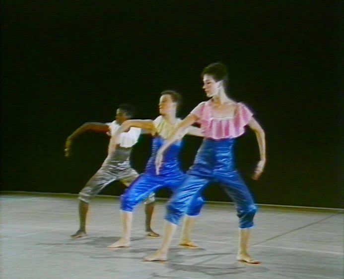 Une Danse blanche avec Eliane (1ère version : 1980, 7', couleur. 2e version : 1980, 8', noir et blanc. Réalisations anonymes). Créé à l’occasion de l’inauguration de la Maison de la danse de Lyon, ce solo de Dominique Bagouet, accompagné par Eliane Lencot à l’accordéon, est un petit bijou, présenté ici en deux captations : celle de la toute première représentation à Lyon et celle, plus informelle, d’une lecture démonstration à Paris - on a droit à une brève introduction du chorégraphe, qui se permettra aussi de s'interrompre à un moment, puis de reprendre. Dans les deux cas, on trouve un Bagouet au faîte de ses moyens, dans une danse bondissante qui se suspend parfois mais ne s'arrête guère. Travaillant ici encore un espace rarement frontal, tissant en biais des directions imprévisibles, c'est un extrait de danse pure, profondément musicale et d'une parfaite simplicité. Un bref instant, on y entrevoit le Bagouet-Keaton qu'on retrouvera plus tard dans F. et Stein (1983) ou dans les solos intermèdes des Petites Pièces de Berlin (1989), clown disloqué à qui le sol semble manquer. On notera aussi la très singulière ambivalence du danseur, qui semble se perdre dans le courant contrasté et changeant de la danse, et dont pourtant le regard tranquille, posé dans des directions claires, témoigne d'une présence au public parfaitement maîtrisée. L'ensemble laisse une impression de nostalgie et d'ivresse joyeuse, qui donne à ce moment de danse abstraite une qualité inexpliquablement poignante.