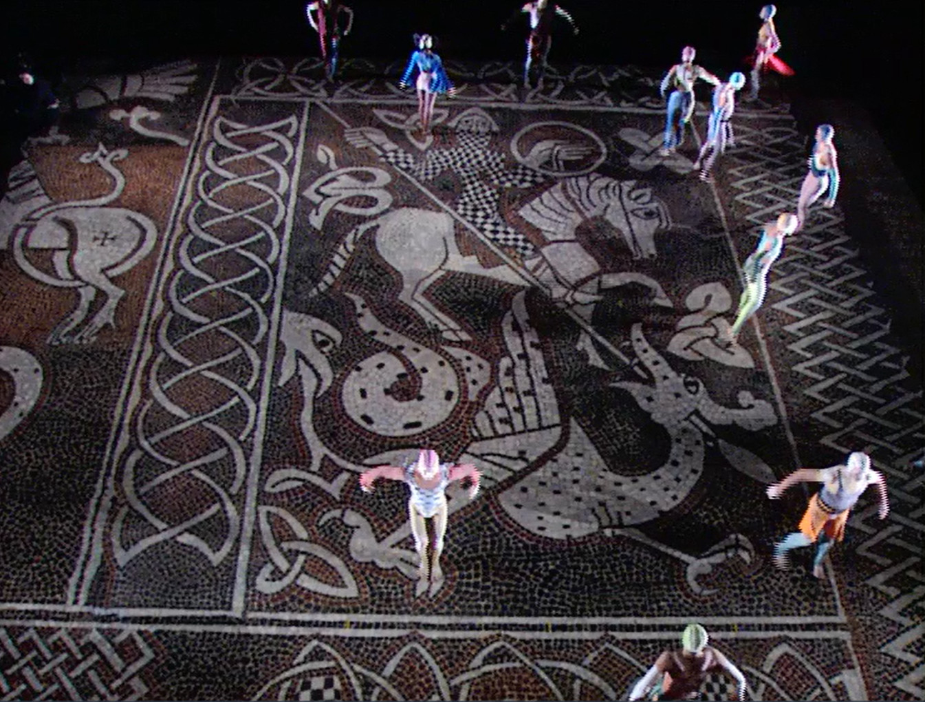 Sur un parterre de mosaïque à l'effigie du saint terrassant le dragon, des groupes de sculptures vivantes s'animent, incarnant chorégraphiquement les frises de l'église Saint-Pierre d'Aulnay de Saintonge. Régine Chopinot retourne aux sources d'inspiration de son spectacle St-Georges, créé en 1991, en juxtaposant aux extraits de sa chorégraphie des images de bas-reliefs d'une église romane de Charente et des croquis de Jurgis Baltrusaïtis (historien d'art et poète) qui lui ont servi de guide gestuel. Doux jeux de correspondances plastiques et rythmiques sur les chants a cappella de l'ensemble Ars Nova.