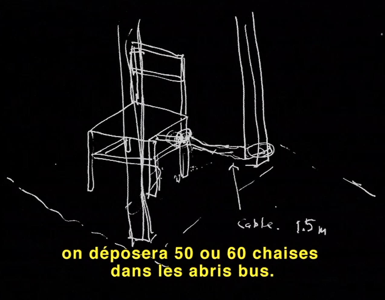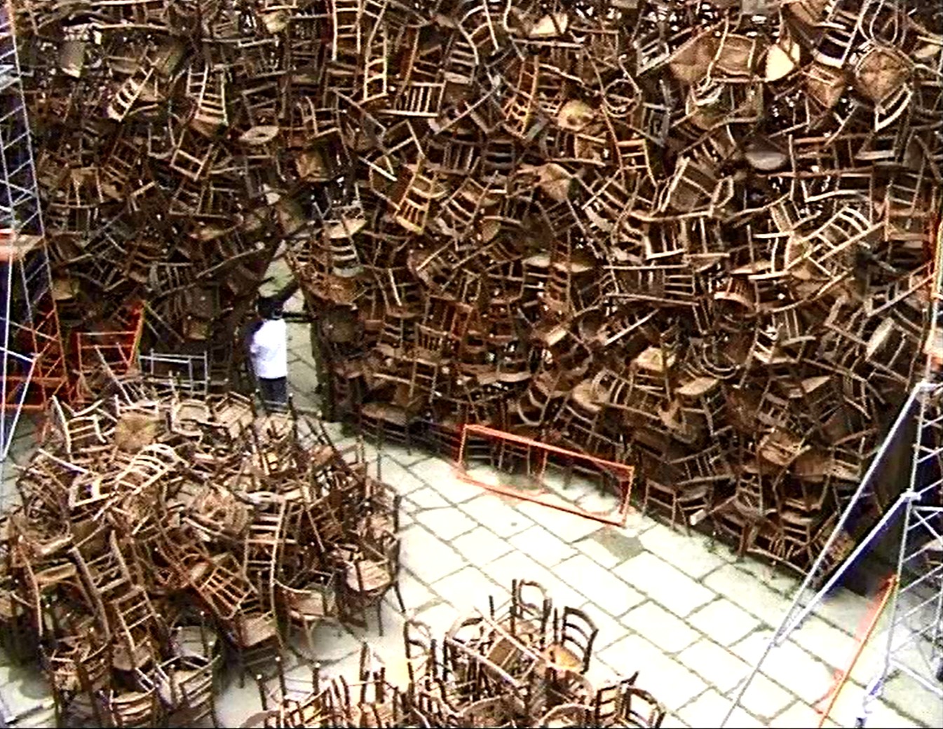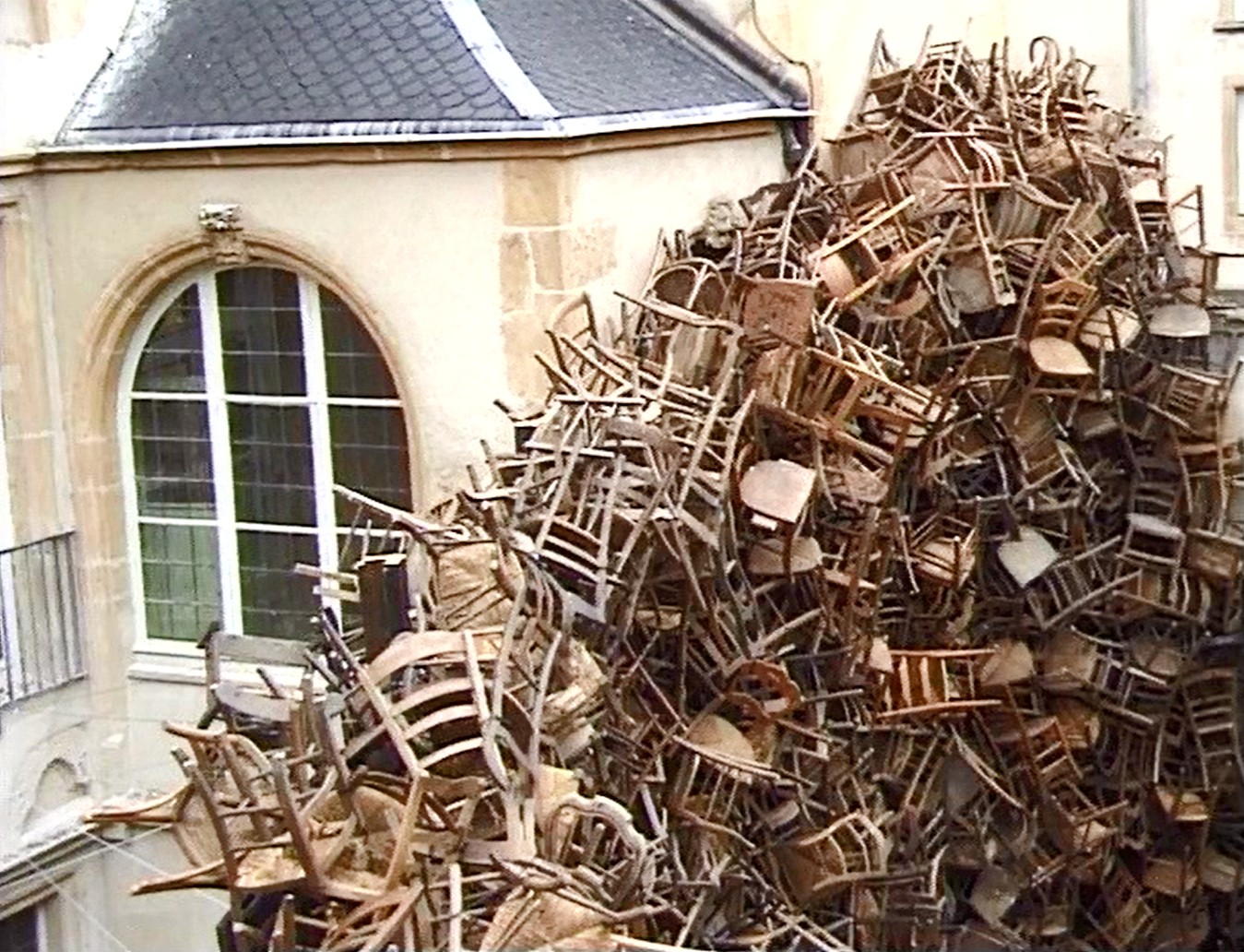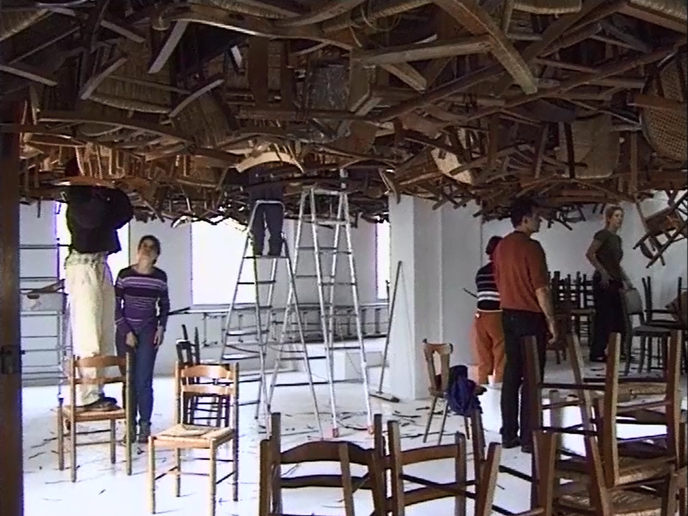 Tadashi Kawamata (né en 1953) explique avec calme à un groupe d'étudiants tout aussi placide le dispositif à mettre en place : transporter des chaises sur les sites puis les empiler sans chercher à les ordonner. Armés de tenailles, de scies électriques et de câbles en plastique, les étudiants vont petit à petit construire un plafond suspendu de chaises renversées dans la synagogue, puis un gigantesque contrefort chaotique de chaises masquant une partie de la façade de l'hôtel Saint-Livier. Quelques chaises solitaires sont placées dans les abris-bus le long de la route reliant les deux sites. Parfois sceptiques, les étudiants s'arrêtent. Une fois l'intallation achevée, ils comprennent le sens de leur participation au projet : "Plus on divisait le travail, plus on devenait léger entre nous..."