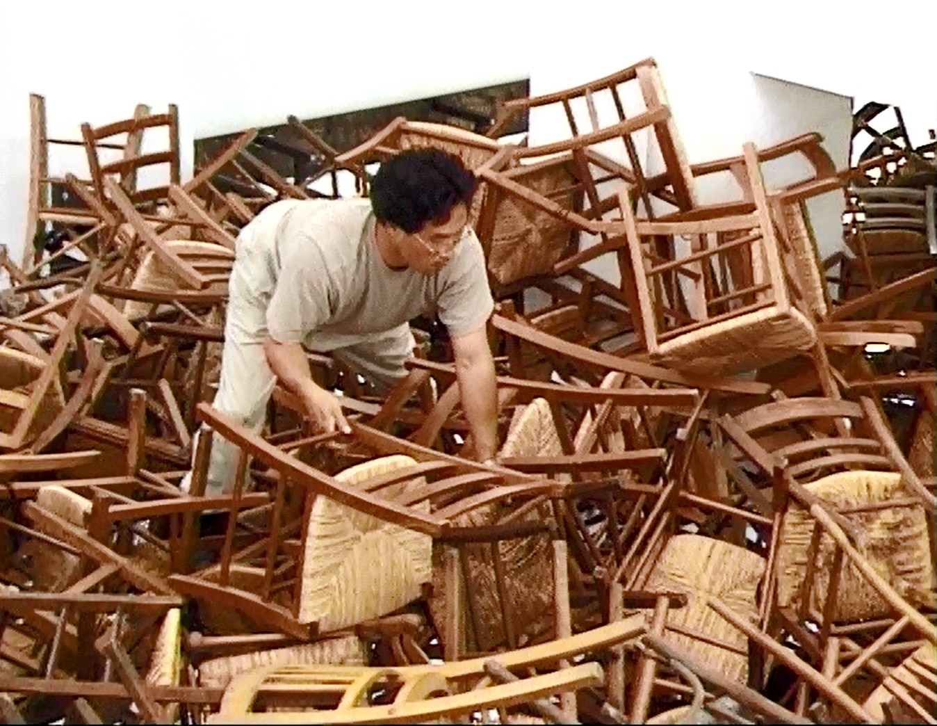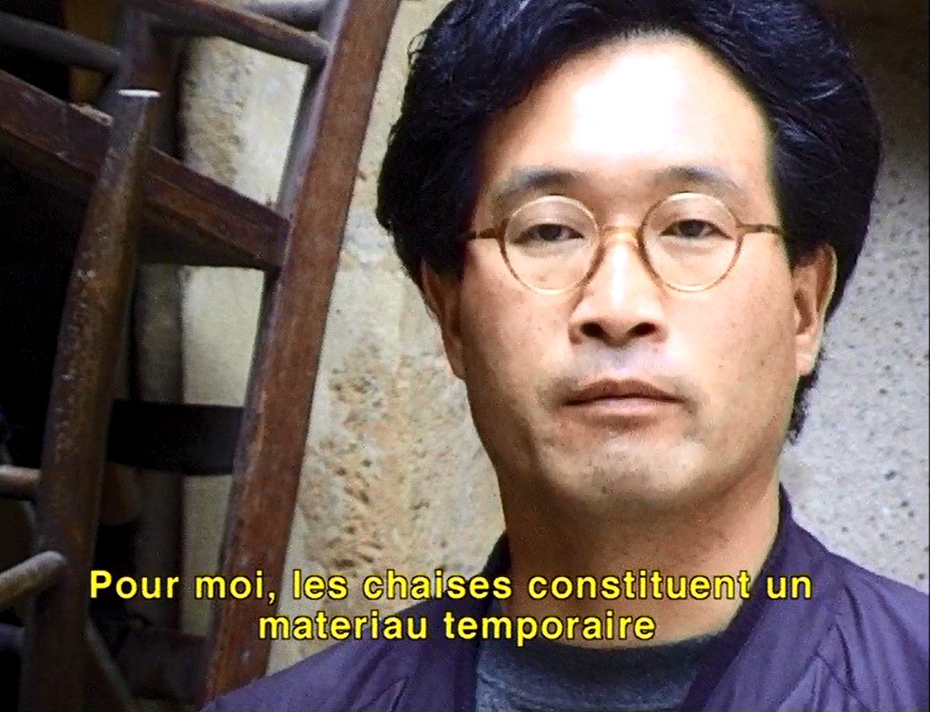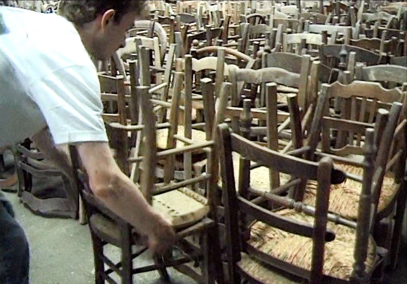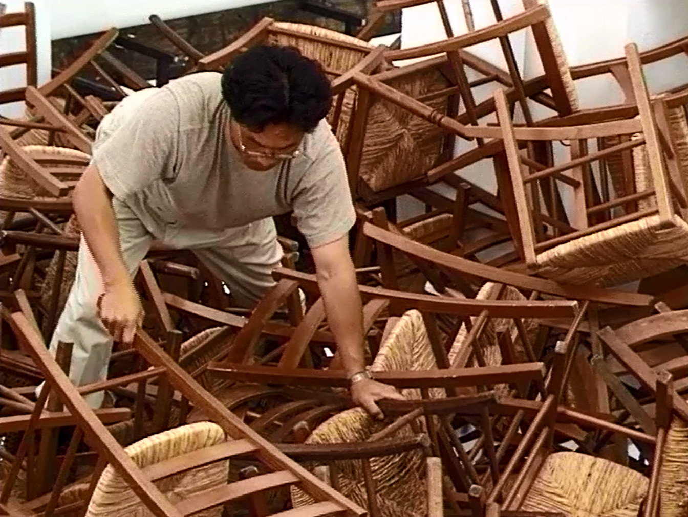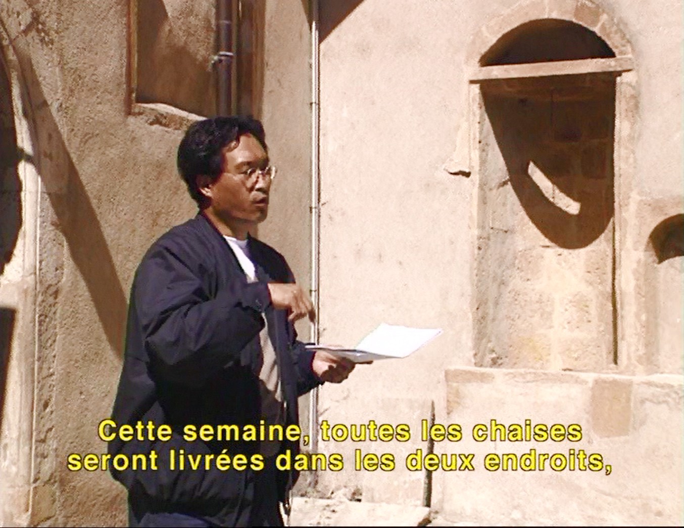 Tadashi Kawamata coordonne les équipes qui réalisent une de ses installations monumentales : deux accumulations de chaises dans deux lieux distants de 35 kilomètres, l'une à l'hôtel Saint-Livier à Metz, l'autre à la synagogue de Delme. A ses côtés, les étudiants des écoles d'art et d'architecture de Metz et de Nancy, attentifs, l'interrogent et s'affairent à la construction de l'œuvre.