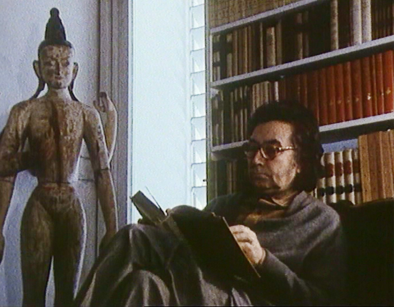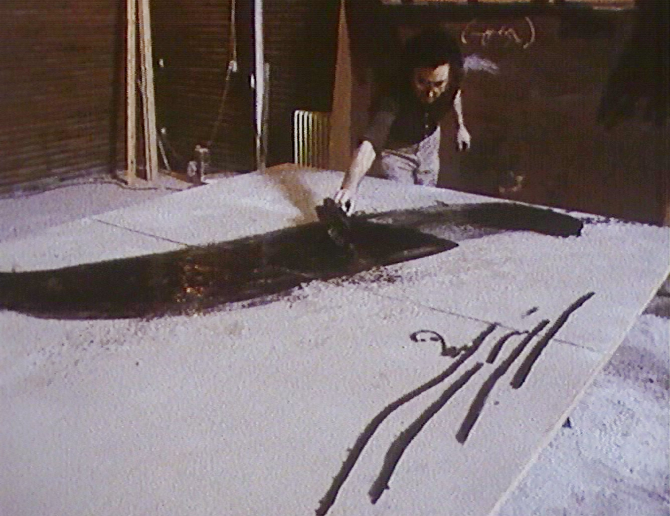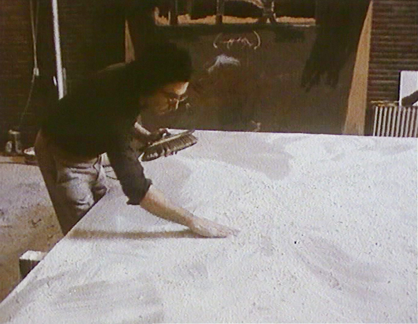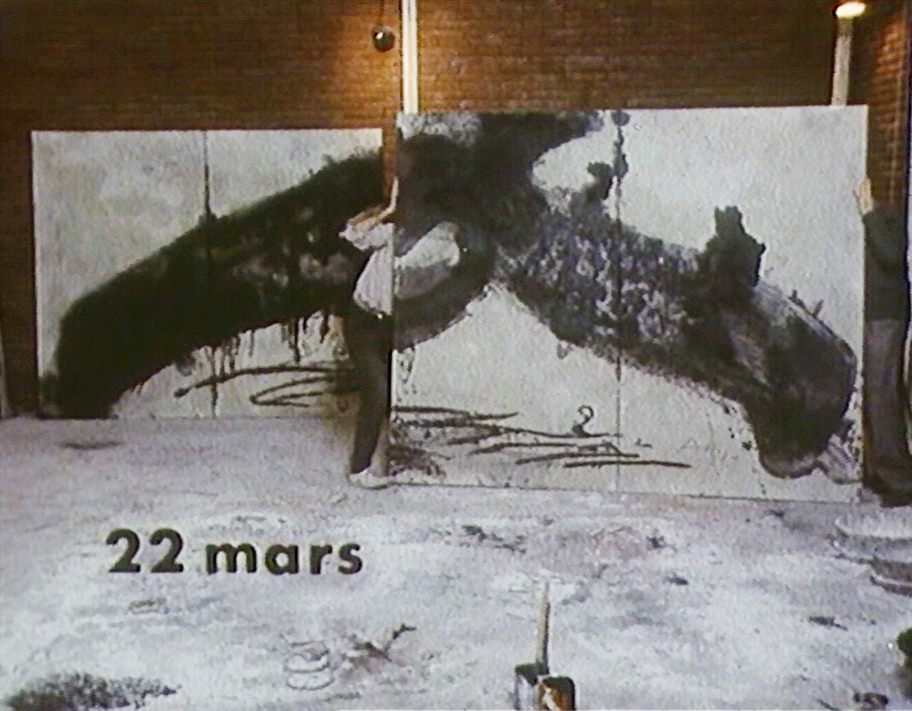 Tapies peint. Une voix off décrit les opérations. Sur des tréteaux, il place un panneau de bois, l'enduit de vernis, le recouvre de poudre de marbre, l'entaille. Cette suite de métamorphoses n'a rien de spectaculaire et la déception pointe : quand la peinture a-t-elle vraiment commencé ? Dans une séquence en durée réelle, l'attention se resserre. Mais là encore, il n'y a que ce qui est donné à voir, car l'atelier n'est pas un espace théâtral où se jouerait une performance ; il n'est qu'un chantier où se construit une oeuvre dans la temporalité banale d'un lent processus d'élaboration. Ainsi, ni l'attention soutenue, ni le questionnement infini, ni les hypothèses émises n'entament le mystère de cette transfiguration : l'incarnation du peintre dans le corps de la peinture.