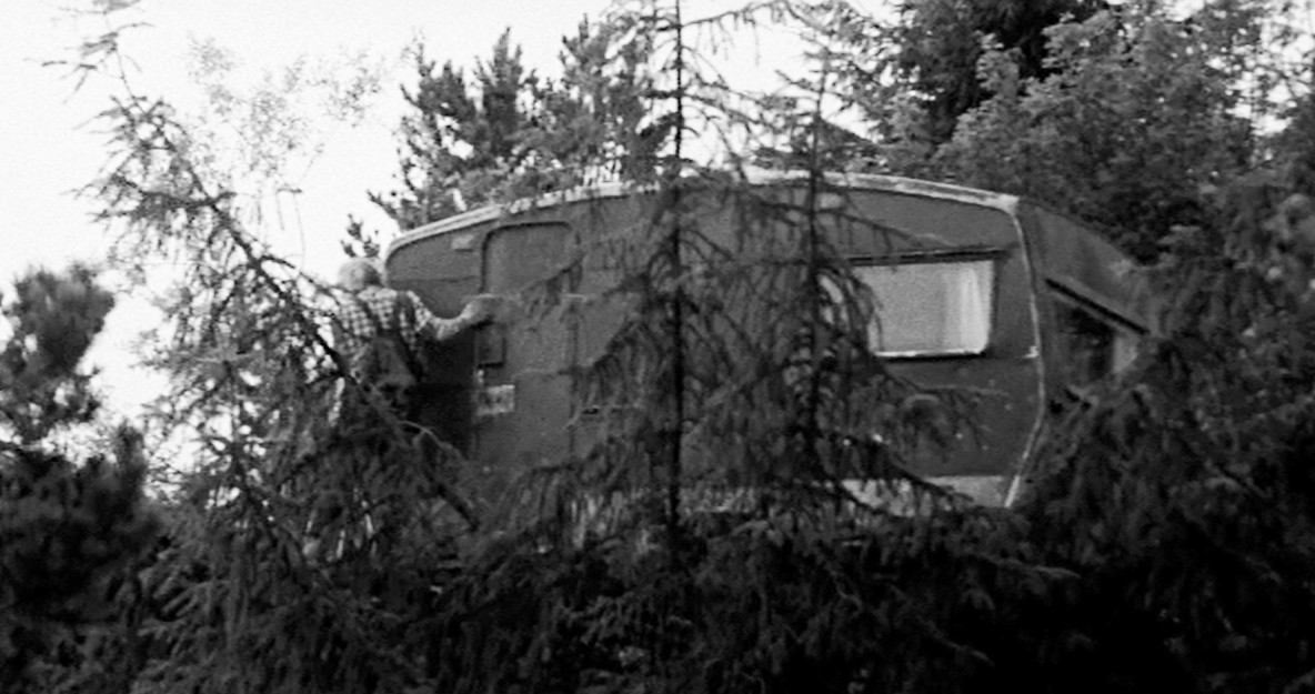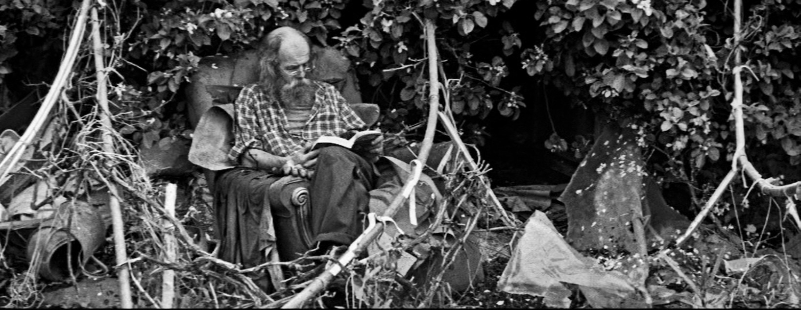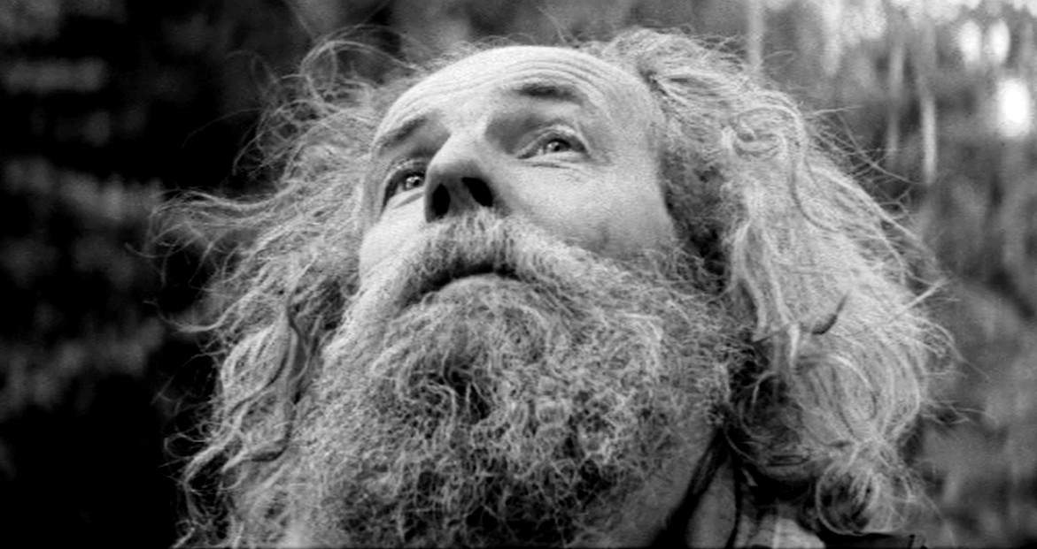 C’est tout d’abord le portrait d’un homme. Portrait silencieux, plein de mystère, d’un individu solitaire, le visage recouvert d’une chevelure épaisse et d’une longue barbe, qui ne s’exprime qu’en sifflotant. Un ermite peut-être ou le dernier survivant d’une communauté, échoué au milieu des sapins, des collines et de lacs, comme Robinson sur son île déserte. Comme lui, cet homme a recomposé un monde à partir de vieux objets rescapés de la civilisation : machine à café, vétuste caravane, tourne-disque sixties, boîtes de conserve rouillées. Une chanson folk, un air de musique indienne rappellent parfois la période hippie. Mais la solitude et la survie n’ont rien ici de dramatique. Comme chez Jean-Jacques Rousseau ou Henry David Thoreau, le retour à la nature est au contraire vécu comme une libération, l’ouverture d’un temps indéterminé où le jeu, le rêve et la contemplation gagnent une place sereine, à l’exemple de cette scène où l’homme se laisse dériver sur un radeau de fortune.