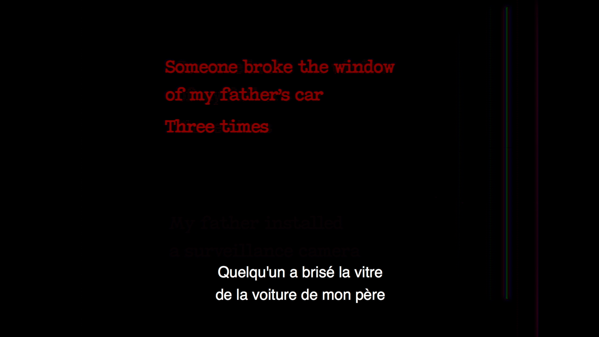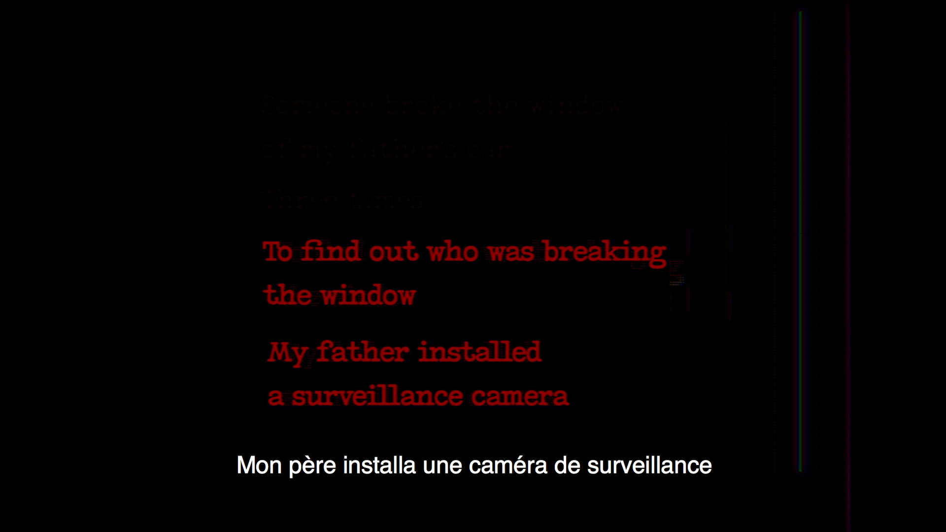 L’idée n’est pas de reconnaître nettement les objets ni les personnes montrées, s’agissant d’images prises d’une caméra de surveillance. Pas de changement d’angle donc, ni de mouvements de caméra, celle-ci étant fixée au même endroit. Inutile donc d’identifier avec exactitude les voitures garées là, celles qui arrivent, celles qui partent encore moins celles qui traversent le champ, à part la voiture de la mère ou du père dont la vitre a été brisée par trois fois. La fixité et la mauvaise qualité de l’image excluent, dès lors, toute velléité spectaculaire ou narrative. Il ne reste presque rien, rien que la banalité du quotidien, des hommes, des femmes, des enfants qui traversent l’espace allant on ne sait où, les gestes « insignifiants » de la vie perçue à travers cet éternel angle de prise de vue. Si la fonction référentielle de l’image est volontairement exclue, c’est qu’une autre attention est sollicitée. Quant à l’attention impulsée, de façon très ténue, par la « recherche du coupable », elle n’est que le prétexte dramaturgique à une invite plus essentielle : Sortir du « Ghetto » (c’est ainsi qu’on appelle le quartier où se trouve la maison familiale), laisser ses parents, les voisins, les passants porter le regard du spectateur vers le hors-champ, non pas seulement celui de l’espace filmique, contigu, qu’on ne voit pas et qu’on imagine, mais plus largement, vers celui d’un peuple absenté, invisibilisé, qu’on voudrait aujourd’hui voir disparaître.