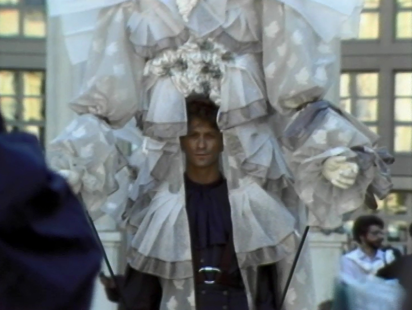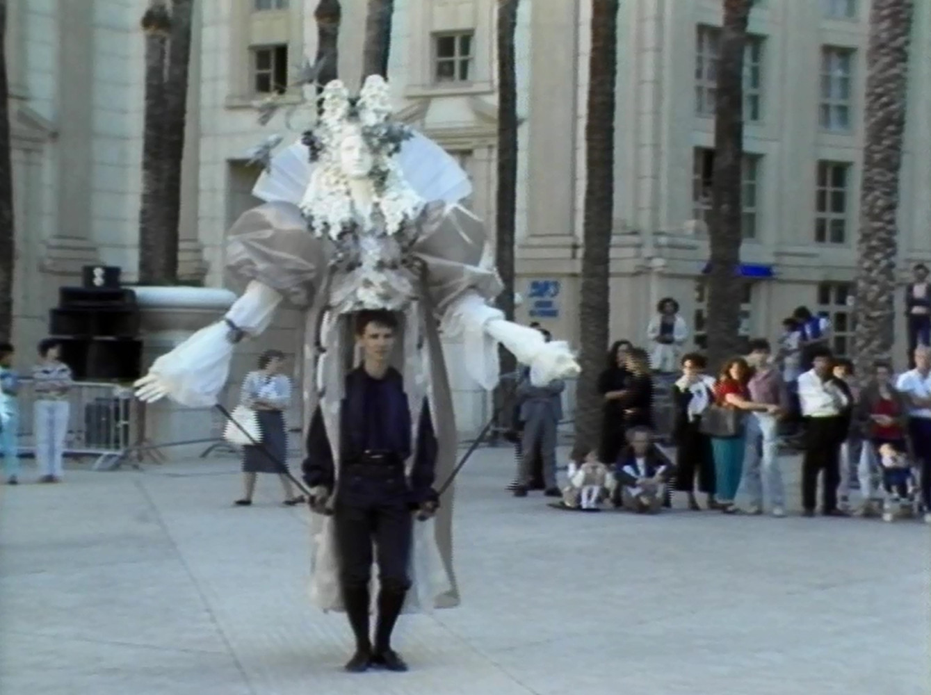 Divertissement 138. Cet événement avait pour mission d’inaugurer dignement la place du Nombre d’or, cœur de l’ensemble architectural fraîchement construit par Ricardo Bofil et fleuron des investissements de prestige de la Ville de Montpellier. À l’aide de longs bâtons, les danseurs manipulent d’immenses marionnettes juchées sur leurs épaules, élégantes créatures emplumées aux figures de plâtre. Encadrées par une partition de percussions interprétée par certains des danseurs, trois petites musiques de Mozart - les mêmes que dans Désert d'amour, créé l'année précédente - animent cette étrange cérémonie, où les créatures esquissent quelques figures baroques avec la lenteur imposée par leur haute taille. L'ensemble évoque un intrigant théâtre d'un autre temps, comme un Bread and Puppet précieux, dans un décor qui, tout réel qu'il soit, semble de carton pâte.