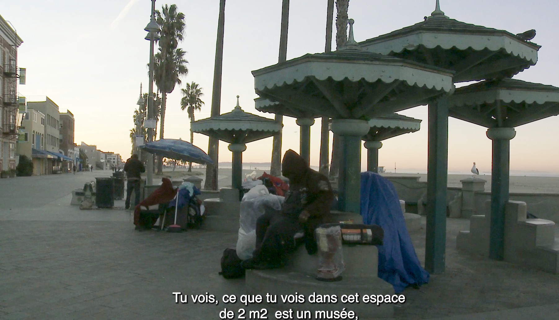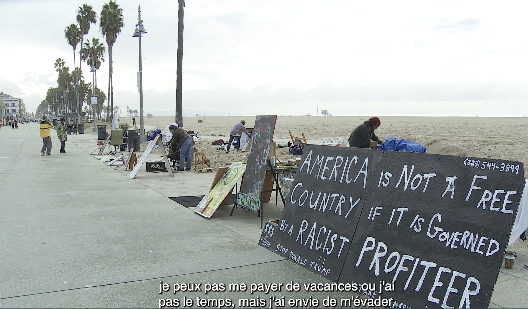 Venice Beach, côte californienne, tout le monde connaît : front de mer, soleil, plages, célébrités, spot de culturisme en plein air. Moins connue, la réalité des sans-abris qui chaque soir "logent" sur ce front de mer et doivent disparaître au petit matin pour que la carte postale s’anime de joggers, de touristes. Le film est composé d’une succession de plans larges, fixes et contemplatifs, qui attrapent dans leur cadre les passants, les artistes fréquentant le lieu, les commerçants, les agents de nettoyage, les sans-abris. En voix off ces derniers expriment leur perception du monde, des Etats-Unis, du président - Trump au moment du tournage -, de la religion. Marion Naccache donne ainsi à entendre des récits étonnants, émouvants, des visions politiques et rend donc visibles ces invisibles, ces indésirables à la lumière du jour.
