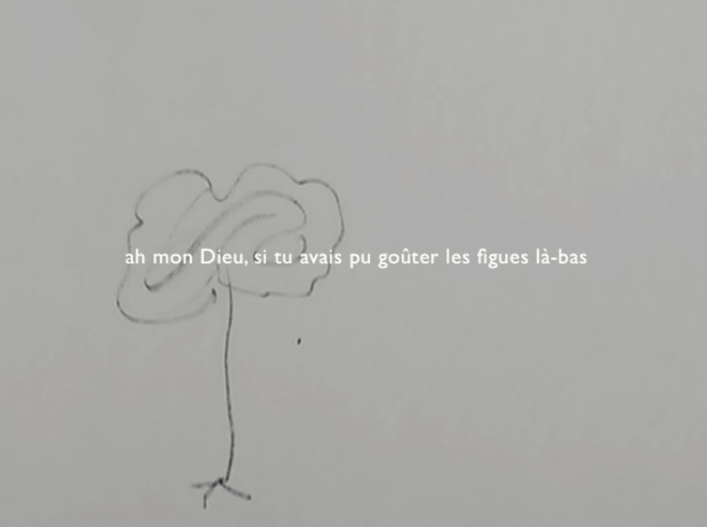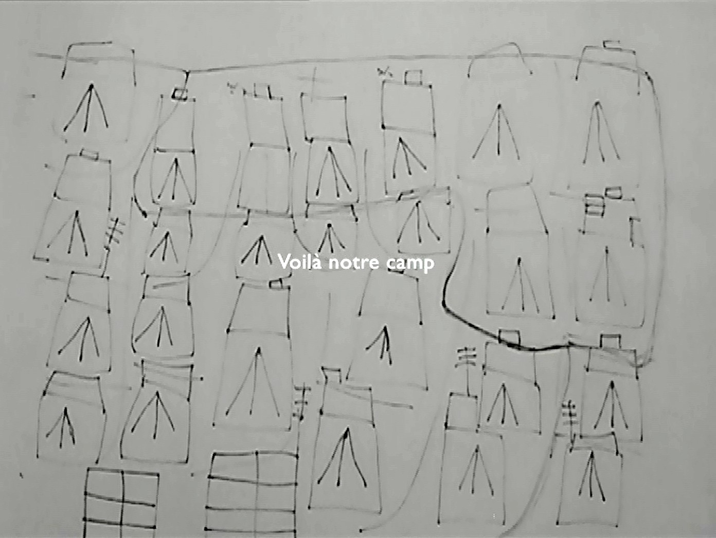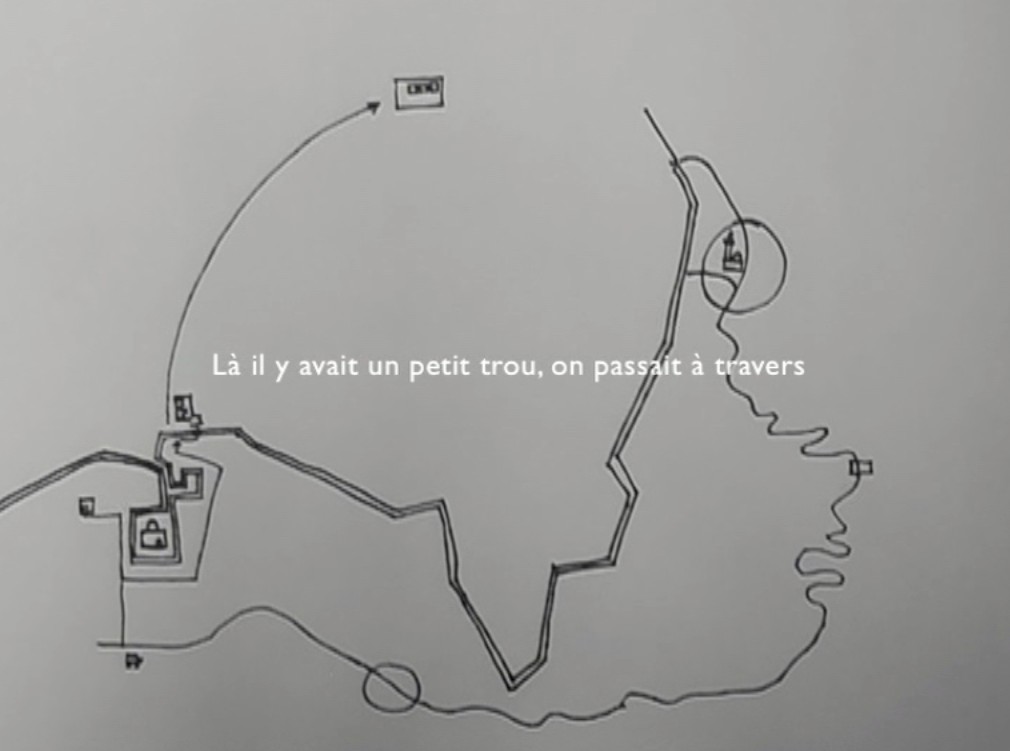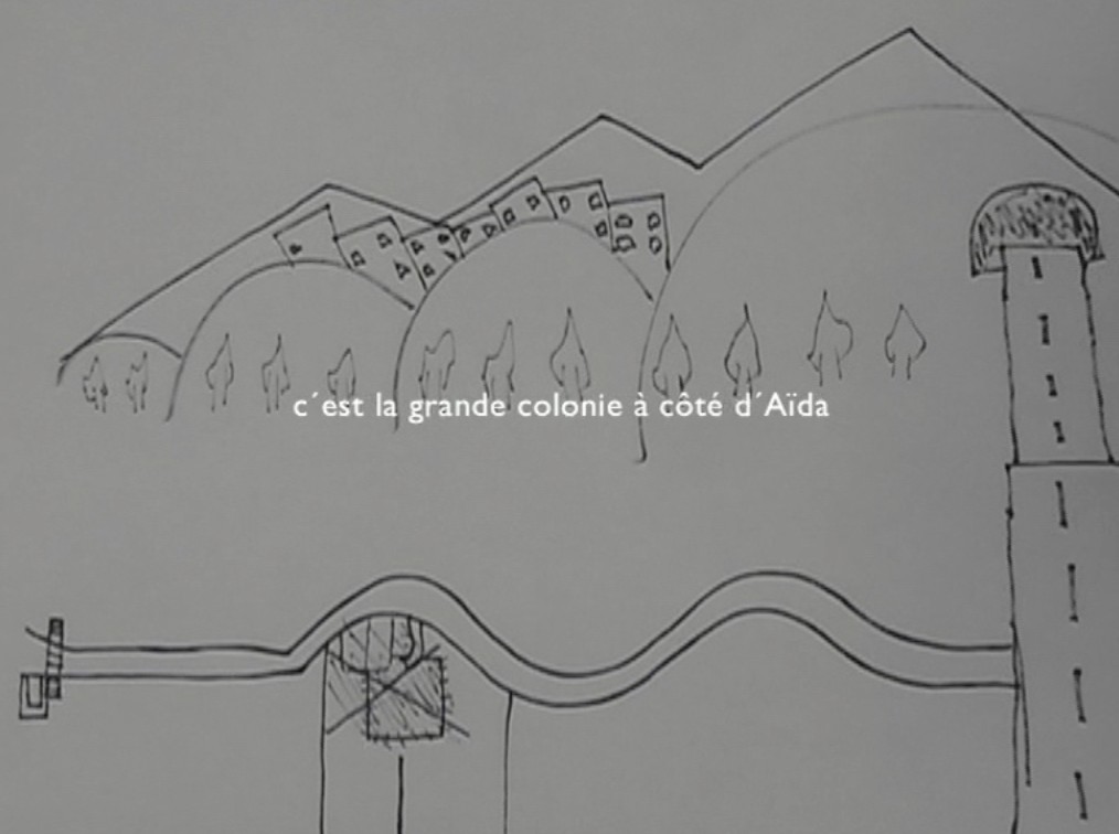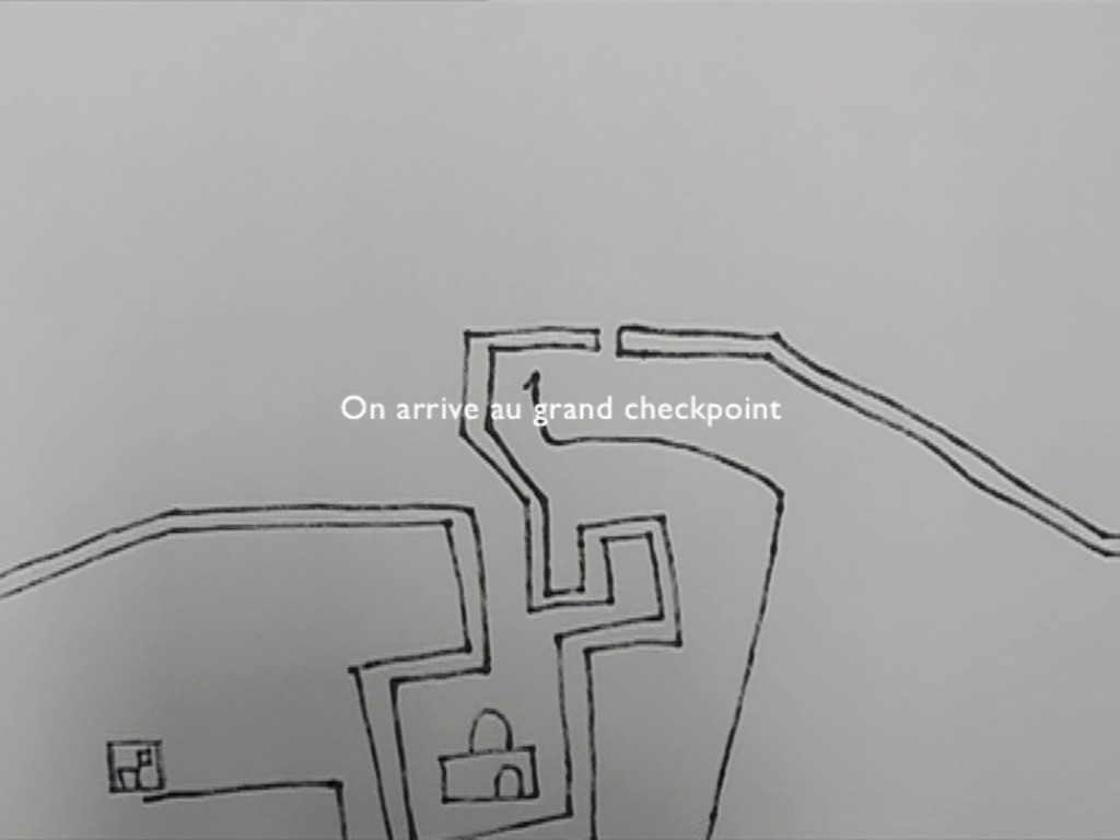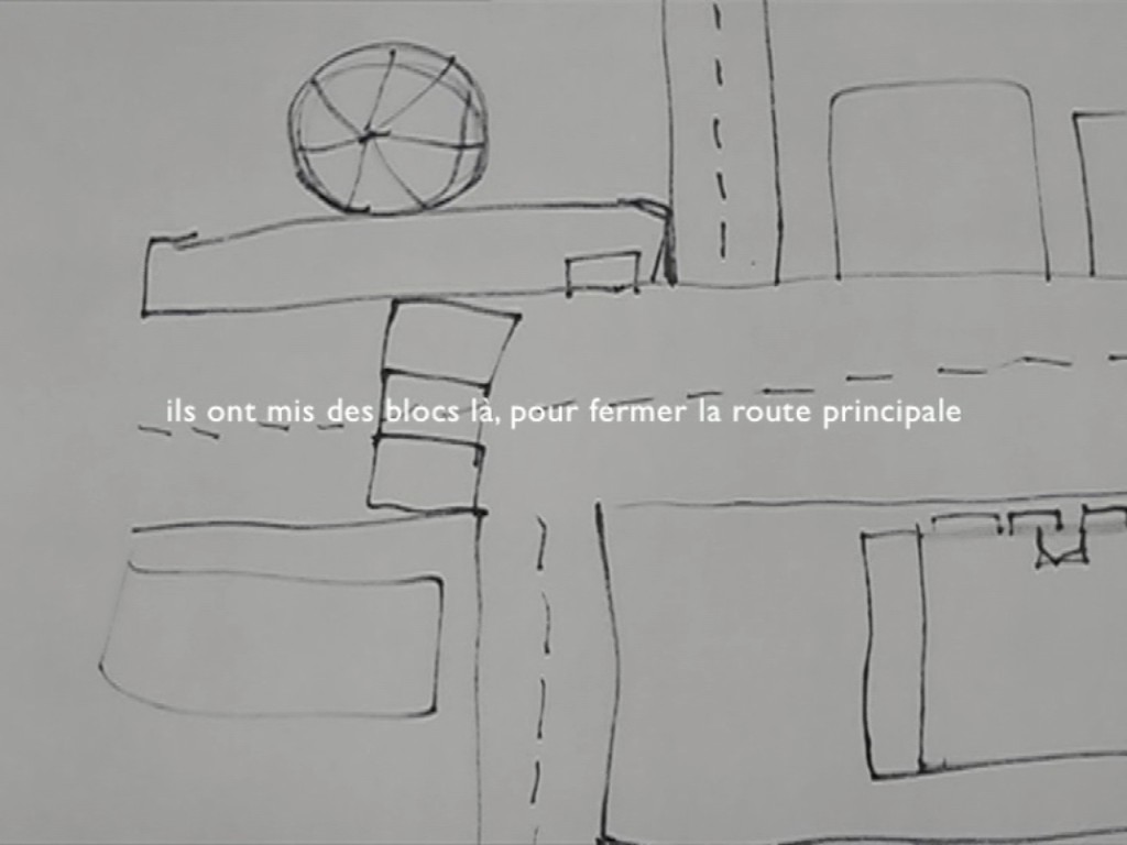 Un écran blanc, sur lequel une pointe noire, par transparence, trace un dessin, ou plutôt un plan. Nul visage, pas plus de main. Seule une voix transforme ces lignes et formes géométriques en maisons, routes et barbelés. En six chapitres, Till Roeskens sollicite plusieurs habitants du camp de réfugiés de Aïda, en Territoires palestiniens, pour dessiner leur environnement quotidien, au gré d'anecdotes édifiantes et tragiques.