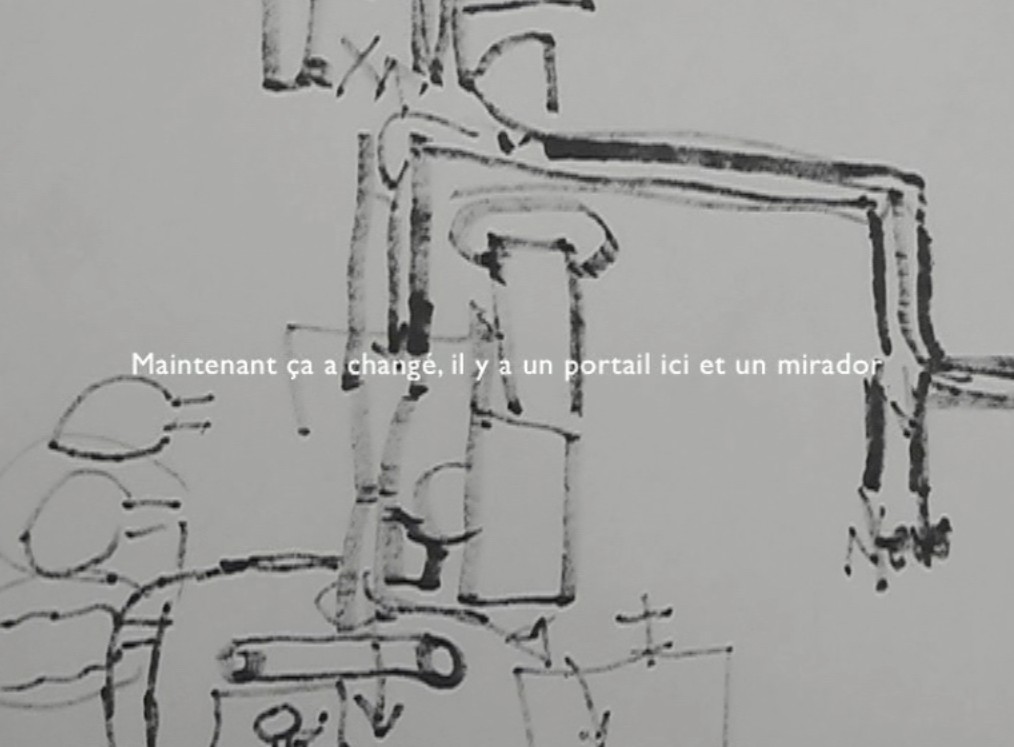 Un écran blanc, sur lequel une pointe noire, par transparence, trace un dessin, ou plutôt un plan.