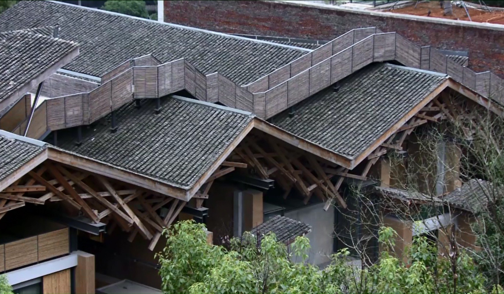 Sur le campus de la plus prestigieuse école d’art du pays, l’architecte a choisi une parcelle en longueur pour construire son bâtiment-paysage. Trente murs monumentaux parallèles encadrent des cours intérieures, des bassins, mais aussi des boites fermées ou se trouvent les chambres et les différents programmes de la maison. Même s’il n’y a rien qu’on puisse décrire comme une façade, il faudrait parler de refends plus que de murs. Ils servent à supporter la gigantesque toiture anguleuse qui donne son nom à la construction : Wa Shan (Montagne de tuiles). En cheminant à travers ces refends, les chercheurs, enseignants ou simples visiteurs découvrent un paysage intérieur fait d’escaliers et de passerelles redondantes, de terrasses et de recoins intimes. Le parcours pour rejoindre sa chambre est volontairement labyrinthique. Wang Shu, reprenant les principes de la peinture traditionnelle Shan Shui (Montagne Eau) invite le visiteur à la contemplation. Mais le propos n’est pas seulement plastique, il est aussi politique : construite à partir de matériaux pauvres (terre du site même, tuiles et fragments de poteries récupérés avec les étudiants), la maison est une invitation faite à ses contemporains à réfléchir sur la manière de construire.