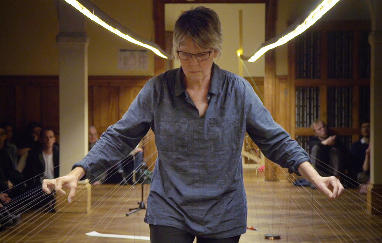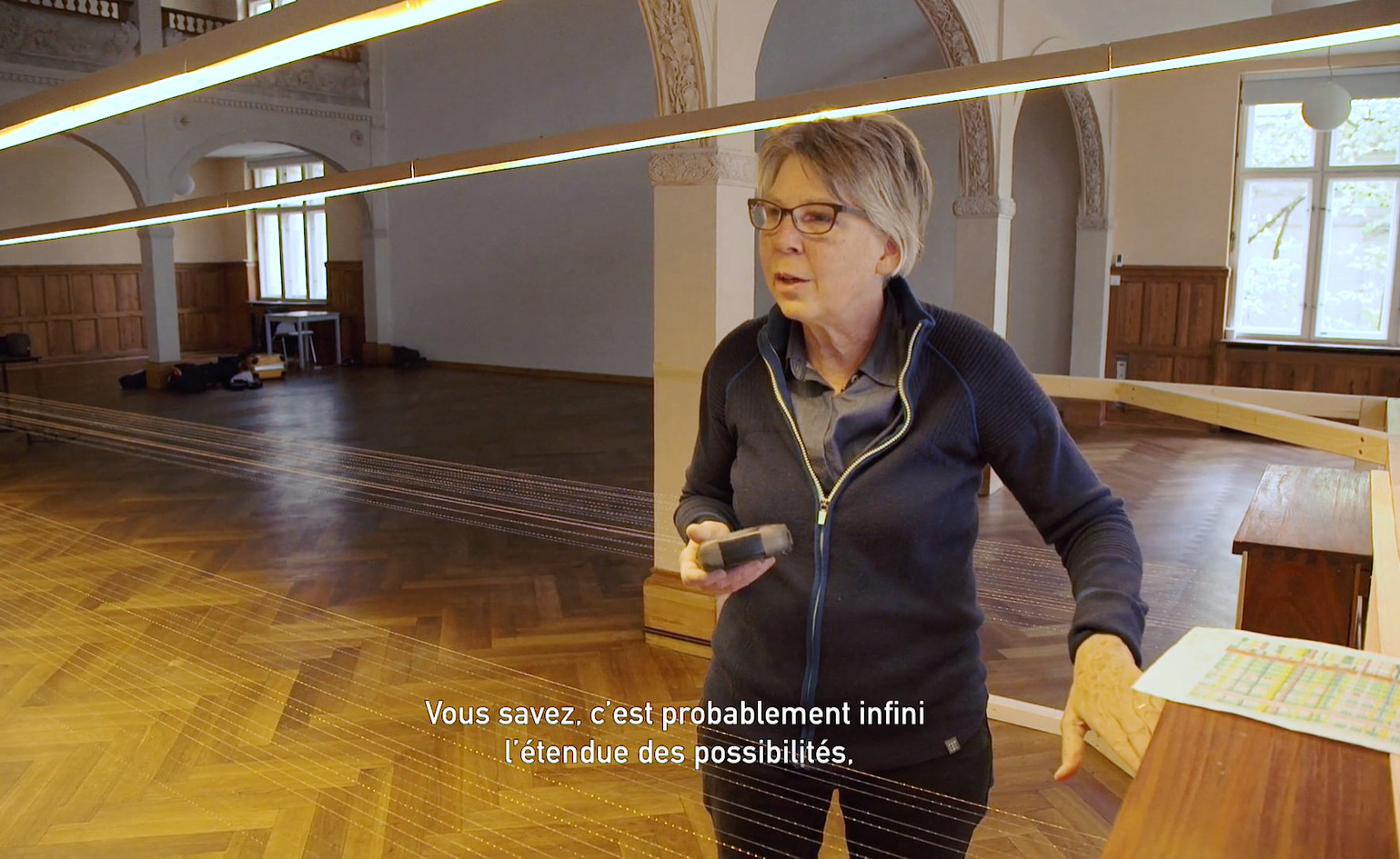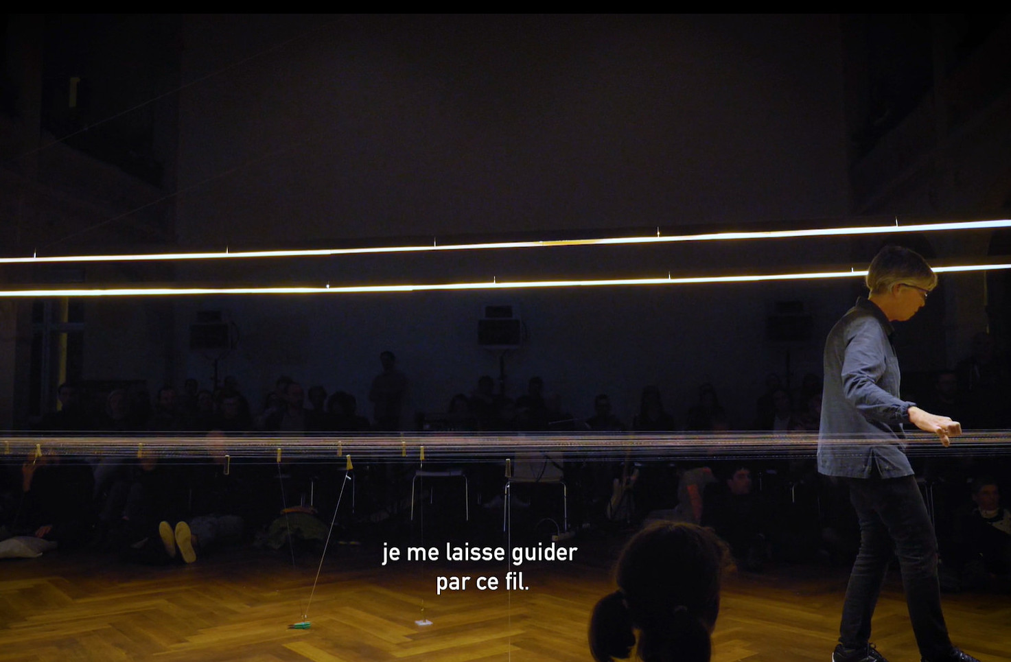 C'est l'instrument qui guide Walking with Ellen Fullman. Soit, the long string instrument (instrument à cordes longues), comme Ellen Fullman a elle-même sommairement nommé cette structure d’une douzaine de cordes minimum. Expliquant les rouages et les spécificités techniques de cet objet tout en longueur – dont les cordes peuvent dépasser les vingt mètres de long – et qu'il lui a fallu apprivoiser, Ellen Fullman fait plus que lever le voile sur les coulisses de sa pratique. Elle révèle ce qui sous-tend sa recherche artistique autant que son rapport à celle-ci : une quête chronophage et passionnée de la justesse et du son ; une exploration obsessionnelle du potentiel des cordes et de l’harmonie ; la mise en jeu stimulante des liens entre l’interprète et l’instrument ; ainsi que la manière dont ce dernier entre en résonance avec le public lors des concerts. Vibrant différemment selon le nombre et l'emplacement des spectateurs, the long string instrument offre une belle métaphore du rapport à l’art et, plus largement, à la vie, de l’artiste américaine.