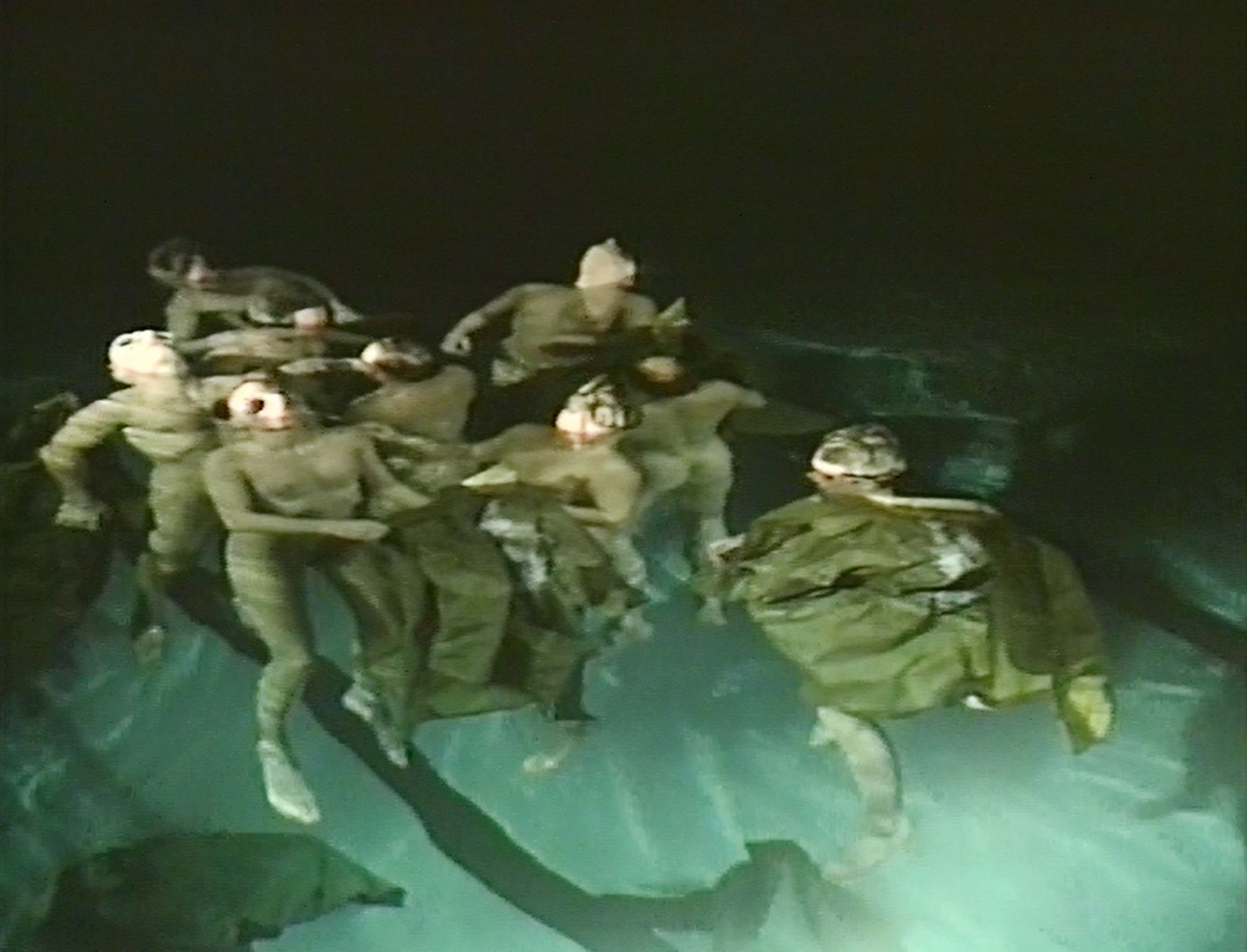 La scène est devenue eau, les danseurs, amphibies. Les corps évoluent, comme en apesanteur, sur une chorégraphie composée de manipulations subtiles et inspirée par les nouvelles sensations d'un espace modifié. L'alternance de moments calmes et violents contribue à rendre tangible l'atmosphère hallucinée de ce spectacle.