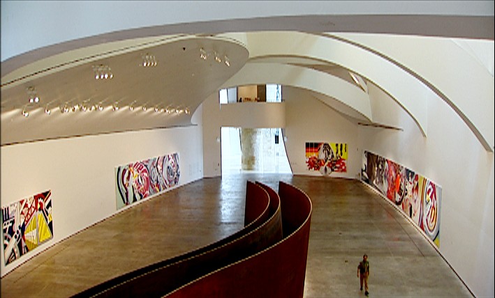 Les interviews de Gehry permettent de reprendre les étapes de conceptualisation du projet. D’abord, des premiers dessins à l’écriture semi-automatique d'où jaillissent des formes fluides comme des poissons tronqués, souvenirs du marché juif de son enfance à Toronto - "nous achetions une carpe vivante que nous mettions dans la baignoire avant que ma grand-mère la tue pour en faire des boulettes". Viennent ensuite des maquettes de petite échelle, ébauches sculptées qui isolent les volumes et évaluent les relations intérieur/extérieur. Enfin, un logiciel utilisé dans l’aviation construit avec rationalité les formes virtuelles des maquettes en carton. Ces images appréhendent peu à peu la fonctionnalité du lieu : trois niveaux d’espaces d’exposition accrochés à un atrium central et monumental. Cette architecture spectaculaire est filmée dans tous ses états météorologiques et les différents points de vue rendent compte de sa position stratégique au croisement d’axes fluviaux et routiers.
